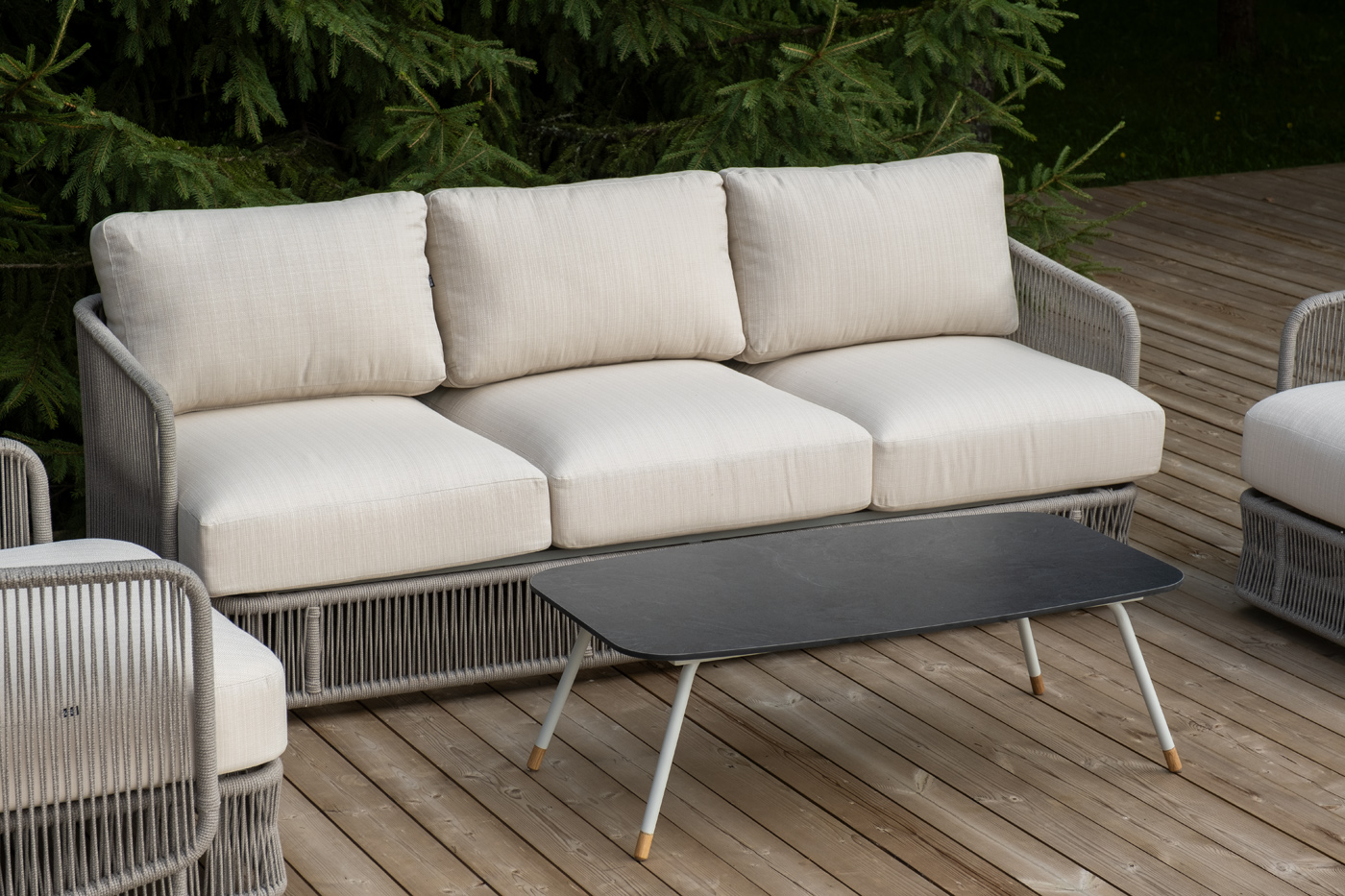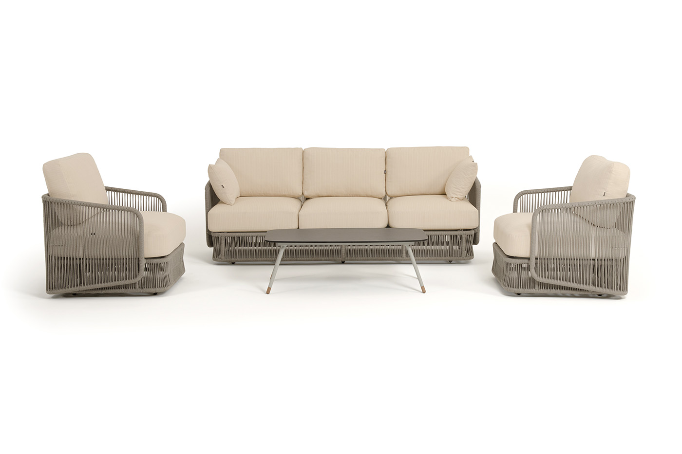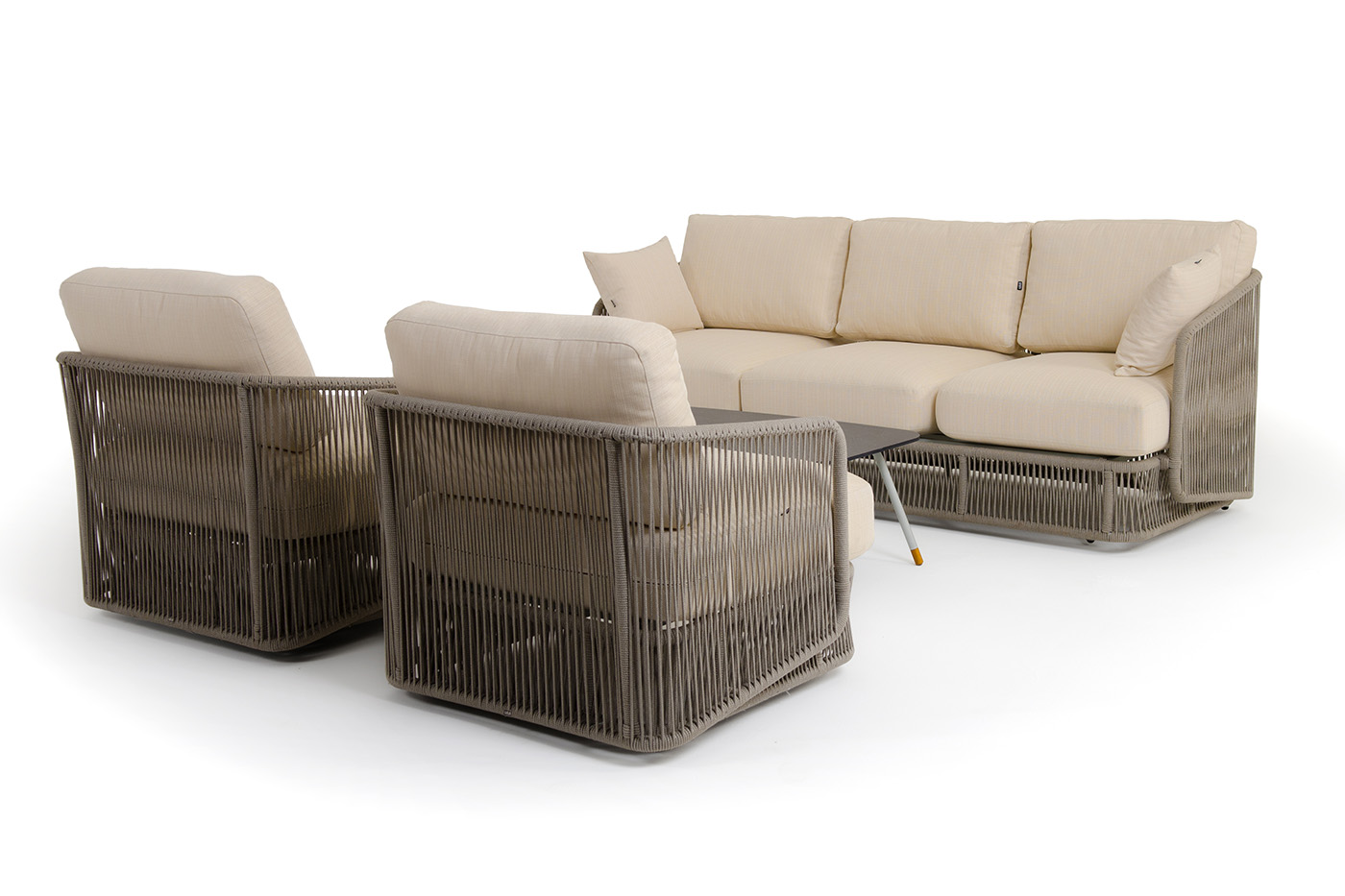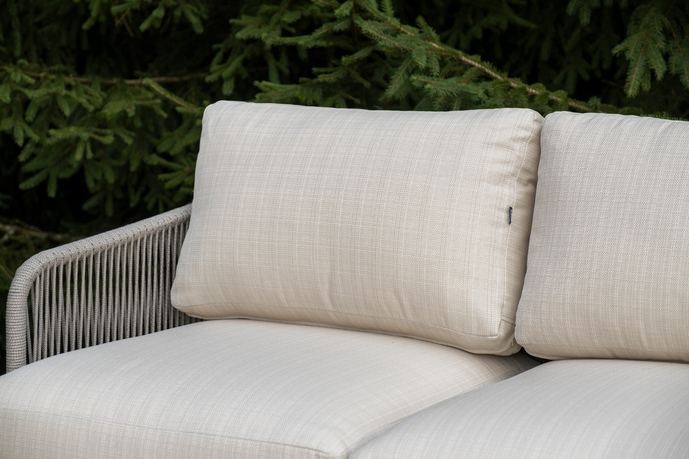 Кресла и диван идут в комплекте с мягкими подушками в чехлах бежево "Альбано" диван 3-местный плетеный из роупа, каркас алюминий светло-серый (RAL7035) муар, роуп серый меланж круглый, ткань Mossle светло-бежевая 1шт. 2 320Х865Х780, "Альбано" кресло плетеное из роупа, каркас алюминий светло-серый (RAL7035) муар, роуп серый меланж круглый, ткань Mossle светло-бежевая 2шт. 920Х865Х750, "Верона" журнальный стол из HPL 120х65, H40, каркас светло-серый (RA L7035) муар, цвет столешницы "серый гранит" 1шт. 1 200Х650Х400,
