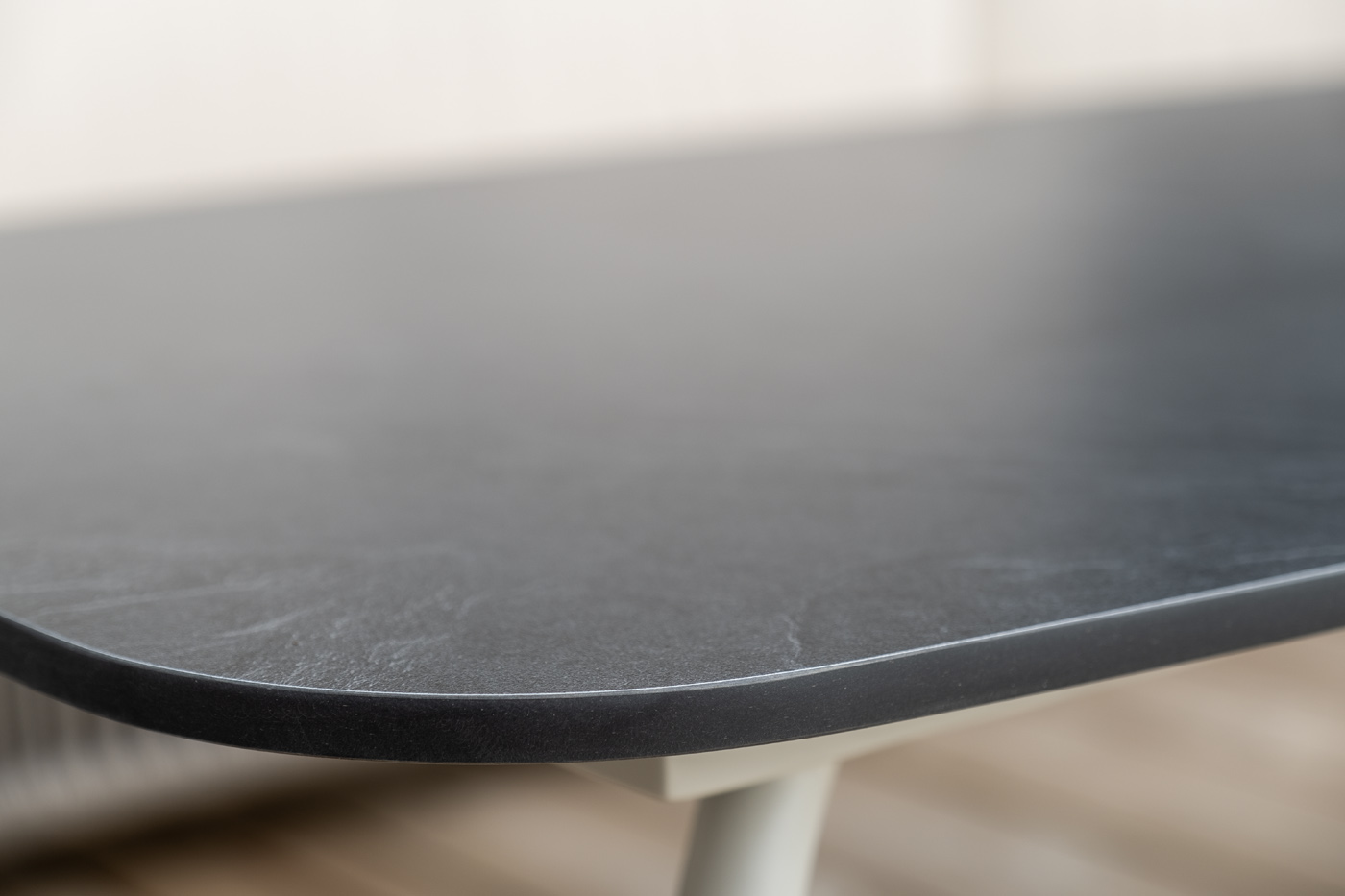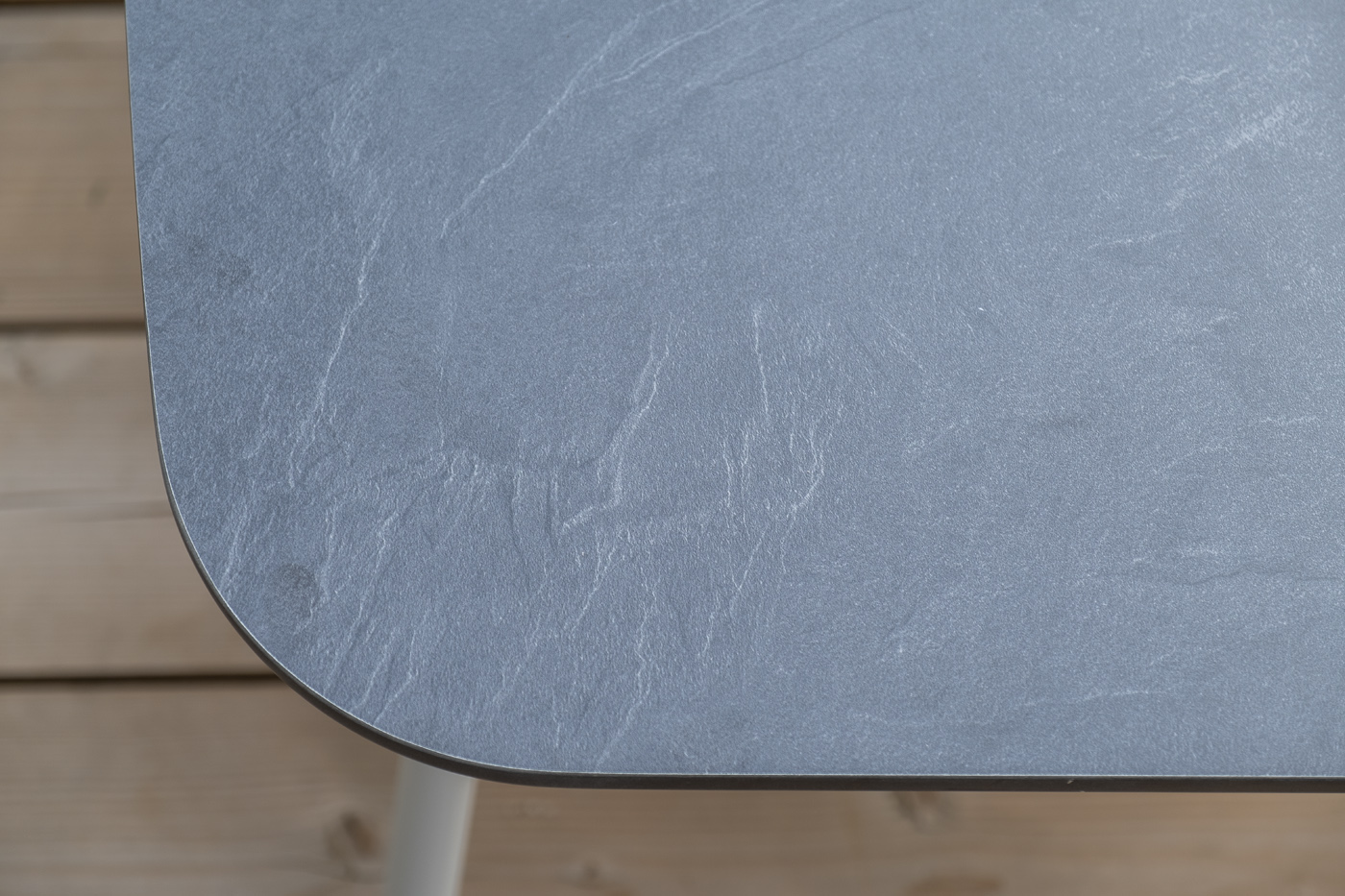 Каркас уличной мебели выполнен из износостойкого алюминия. Его дополняет бежевая ручная оплетка, изготовленная на основе эластичных синтетических лент из полиэфирных волокон высокой прочности (роупа).