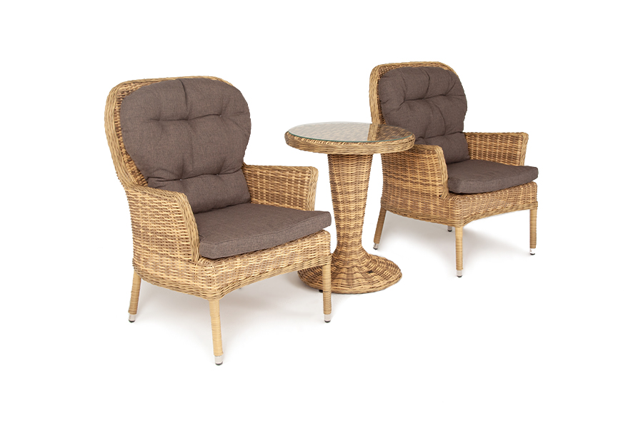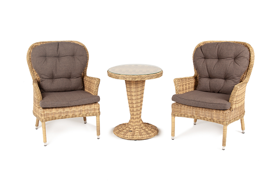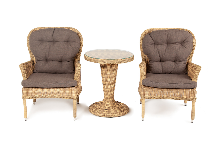 Плетение выполнено вручную искусственным ротангом соломенного цвета, кресло укомплектовано подушками из 100% полиэстера, которые пропитаны специальным составом, обладающим влагооттал "Алиса" кресло плетеное, цвет соломенный 2шт. 710Х820Х1 105, "Леванте" стол круглый из искусственного ротанга, цвет соломенный 1шт. 600Х600Х750,
