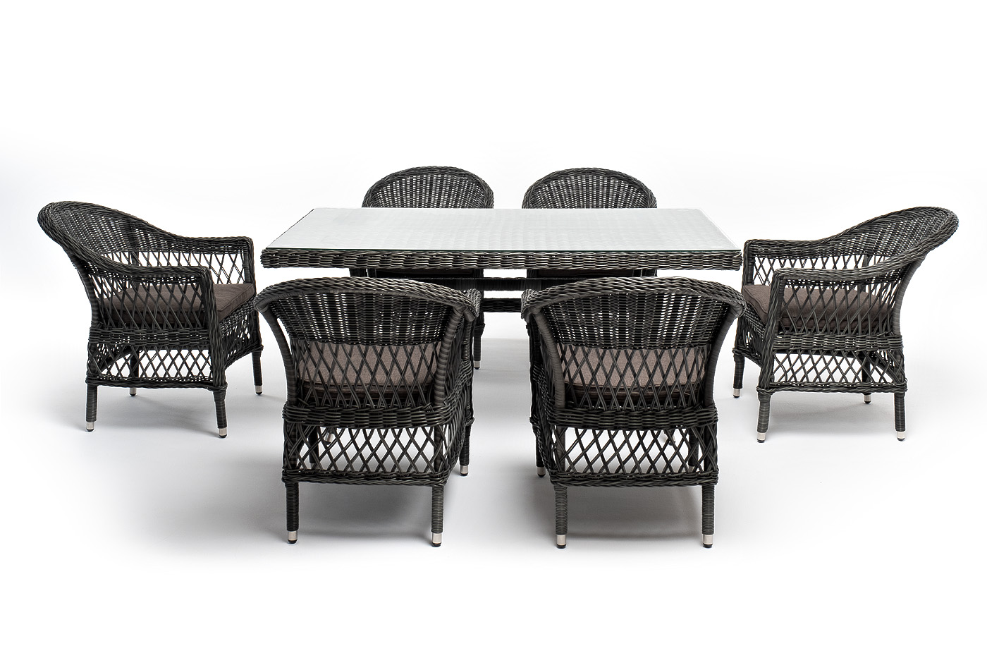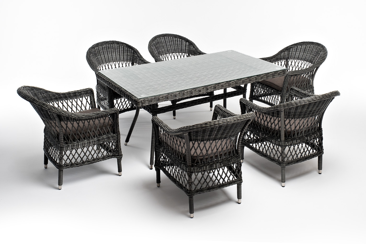 На креслах расположились мягкие подушки серого оттенка. Их чехлы изготовлены из полиэстера, плотность которого 300гр/м2. Ткань про "Сицилия" плетеный стул из искусственного ротанга, цвет графит 6шт. 590Х640Х820, "Латте" плетеный стол из искусственного ротанга 160х90см, цвет графит 1шт. 1 600Х900Х750,