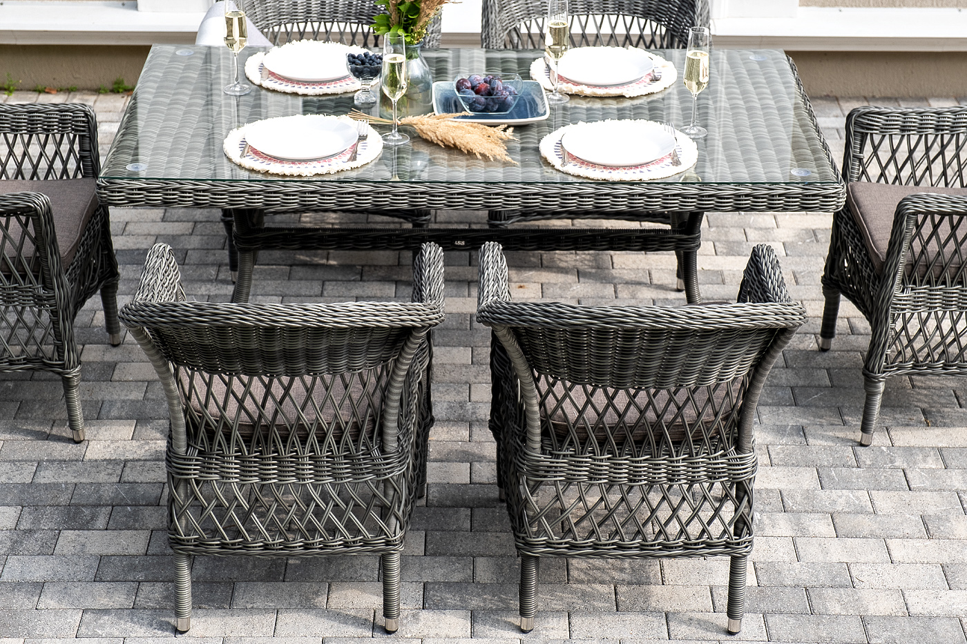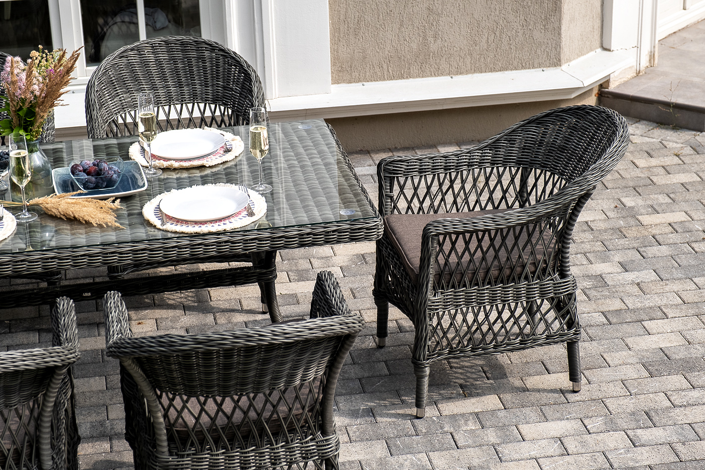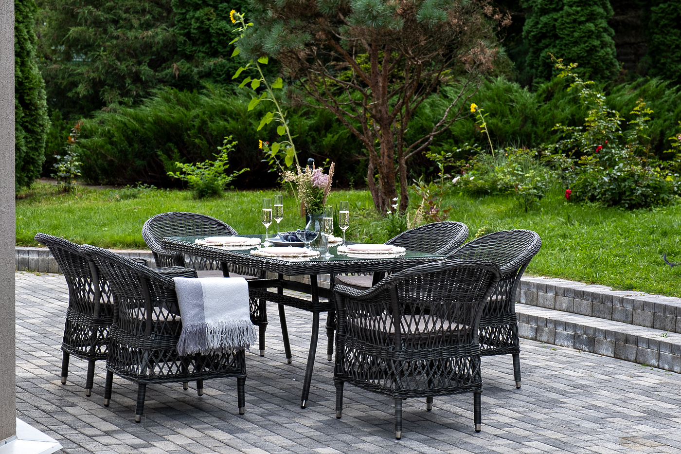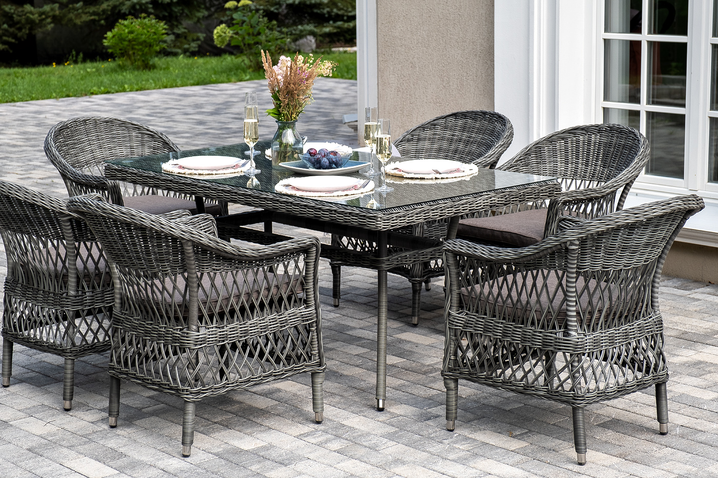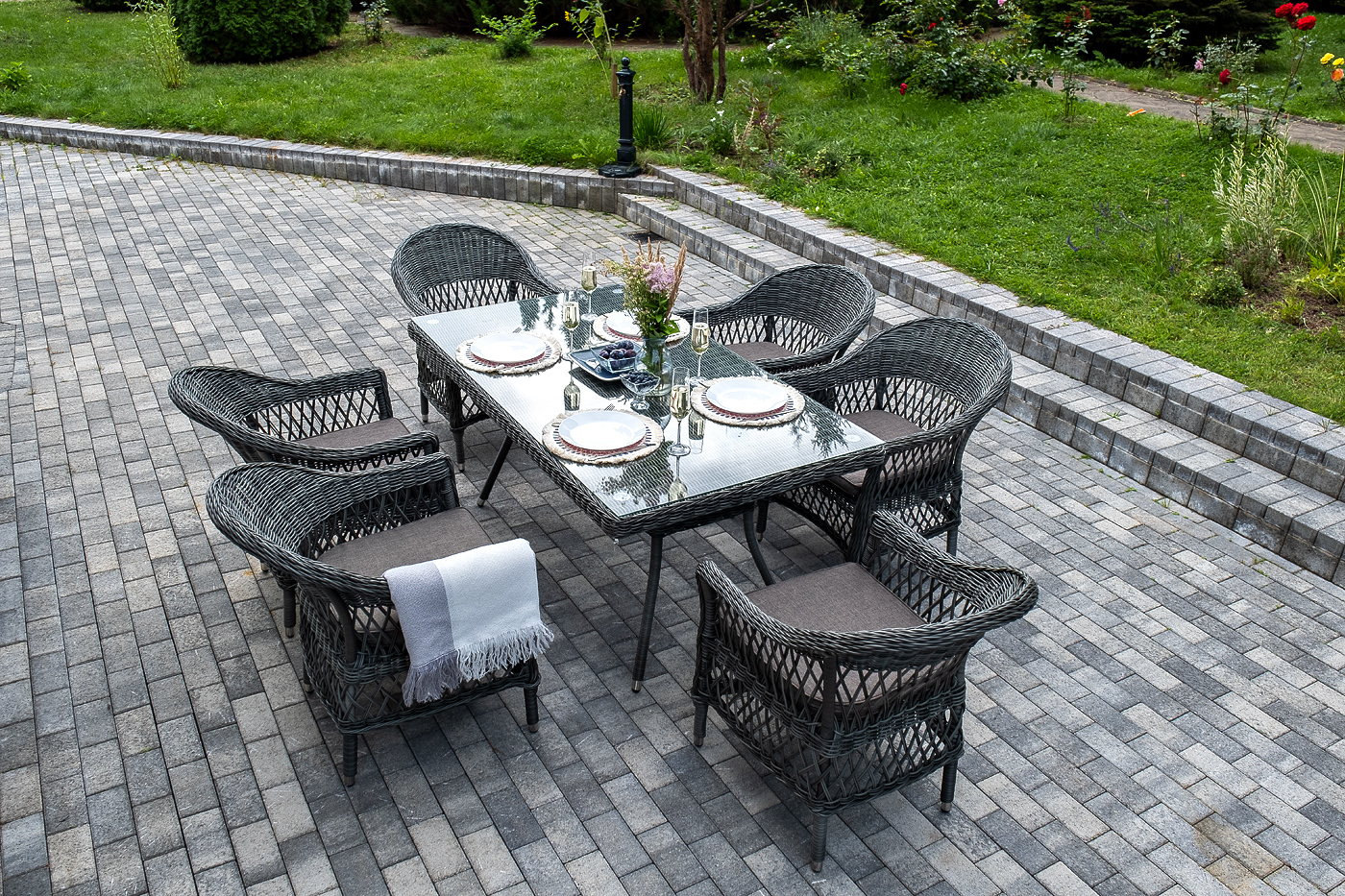 Обеденная группа «Амароне» относится к числу садовой мебели для обустройства открытых террас и веранд.