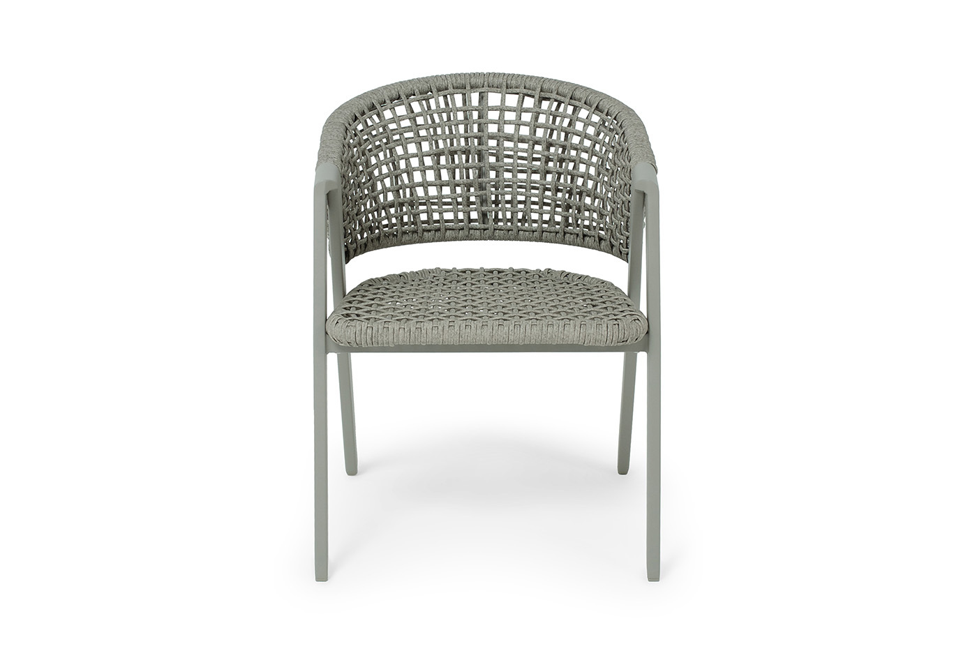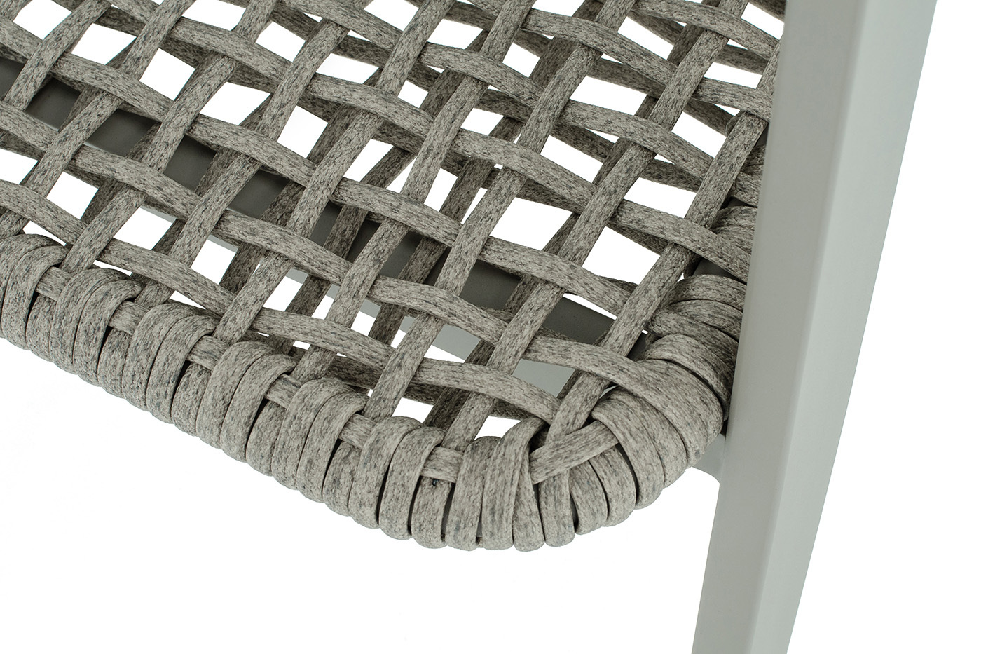 Стул выполнен из алюминиевого каркаса, который вручную оплетен круглым искусственным ротангом. Приятный на ощупь и напоминает шерстяное плетение. Цвет каркаса и оплетки – серый. На ножках стула идут серые пластиковые наконечники (заглушки).