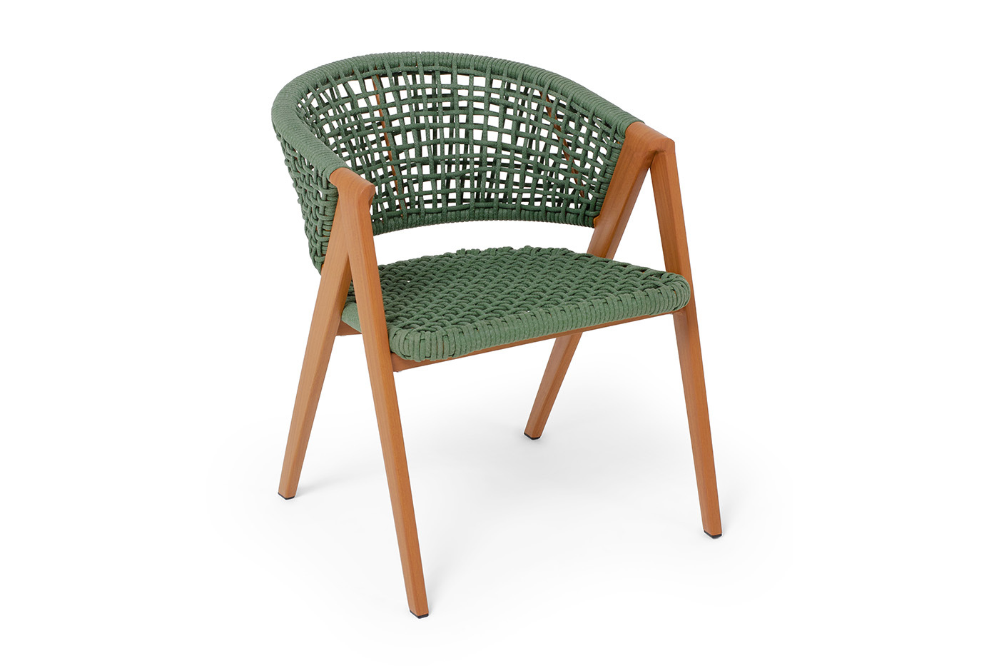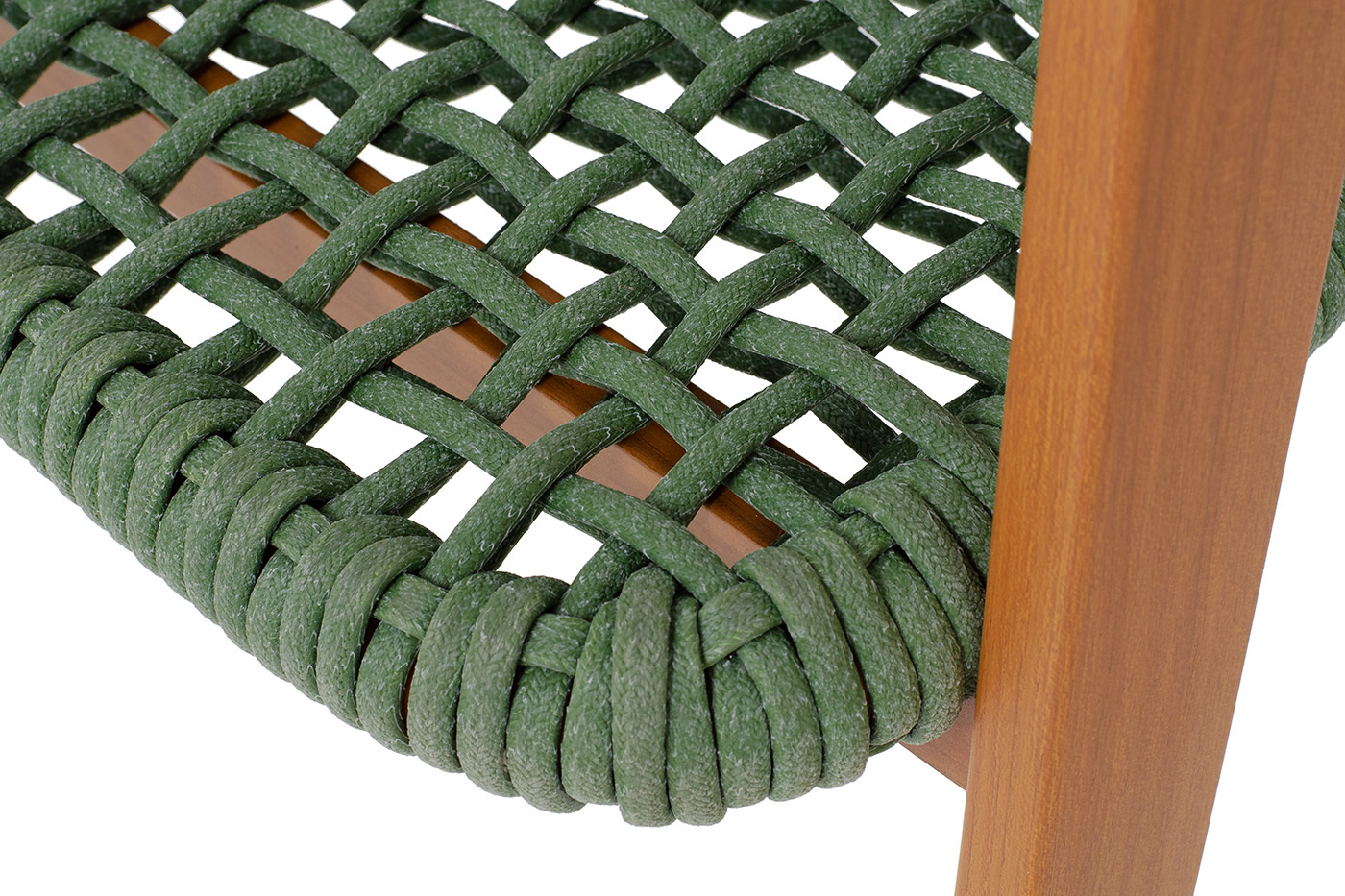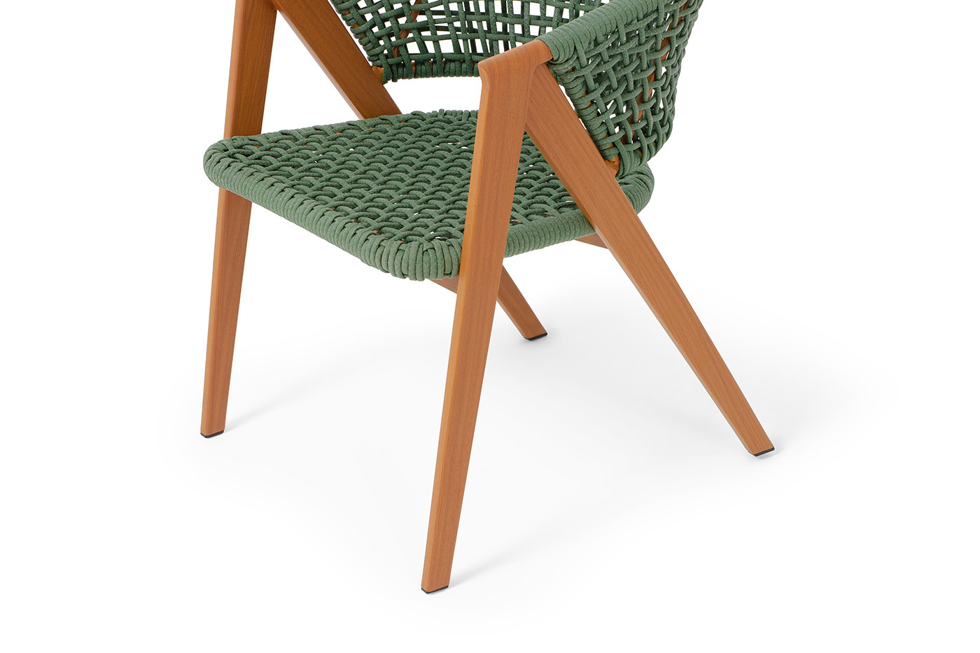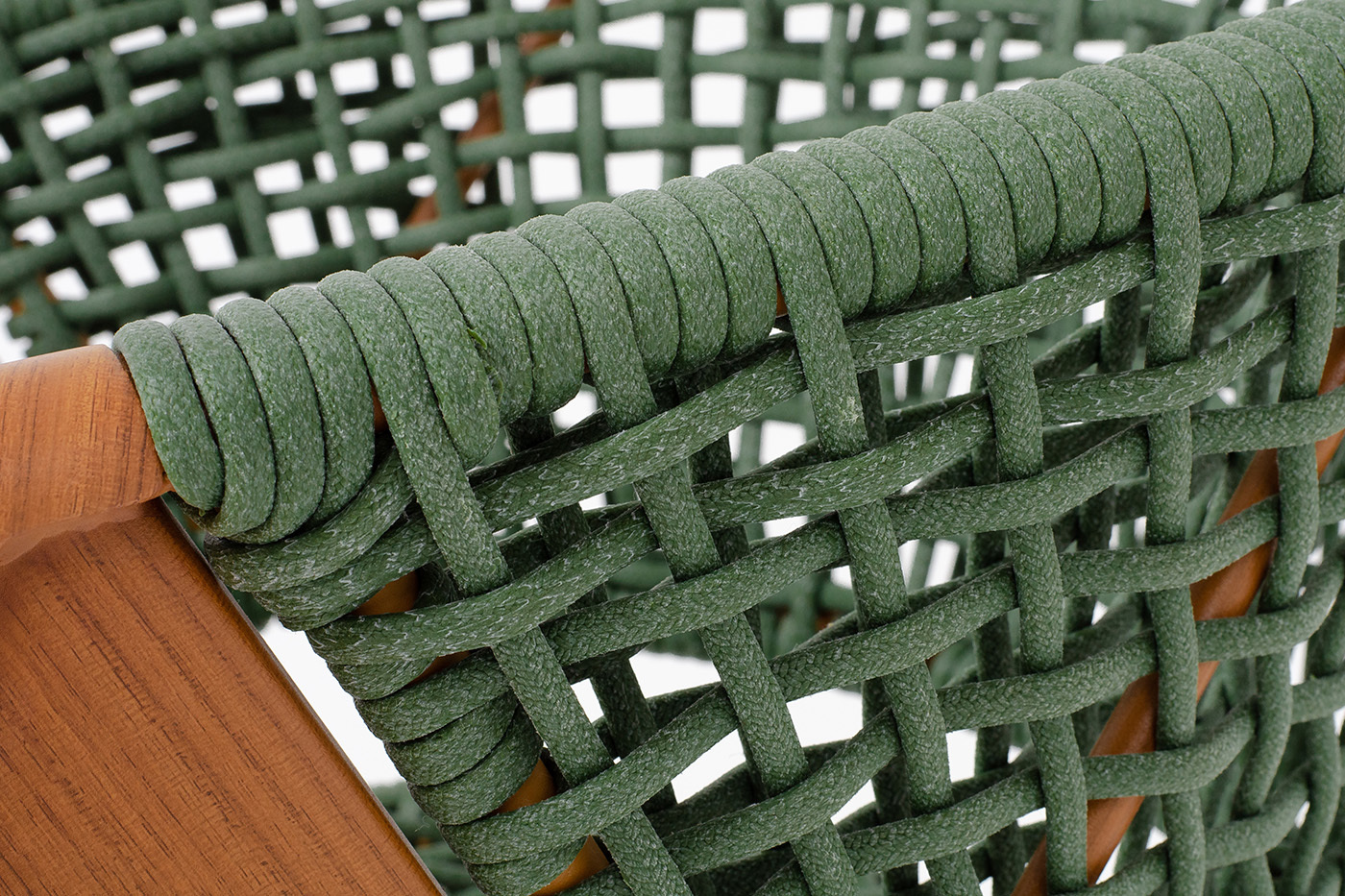 Стул выполнен из алюминиевого каркаса, который вручную оплетен круглым искусственным ротангом. Приятный на ощупь и напоминает шерстяное плетение. Цвет каркаса – «под дерево», оплетки - зеленый. На ножках стула идут черные пластиковые наконечники (заглушки).