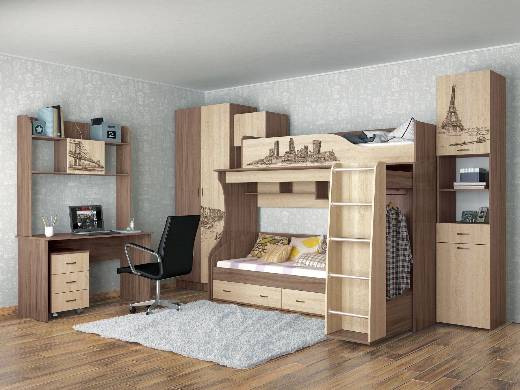 - Широкий выбор модулей: функциональная кровать-чердак, вместительные шкафы и пенал с выдвижными ящиками