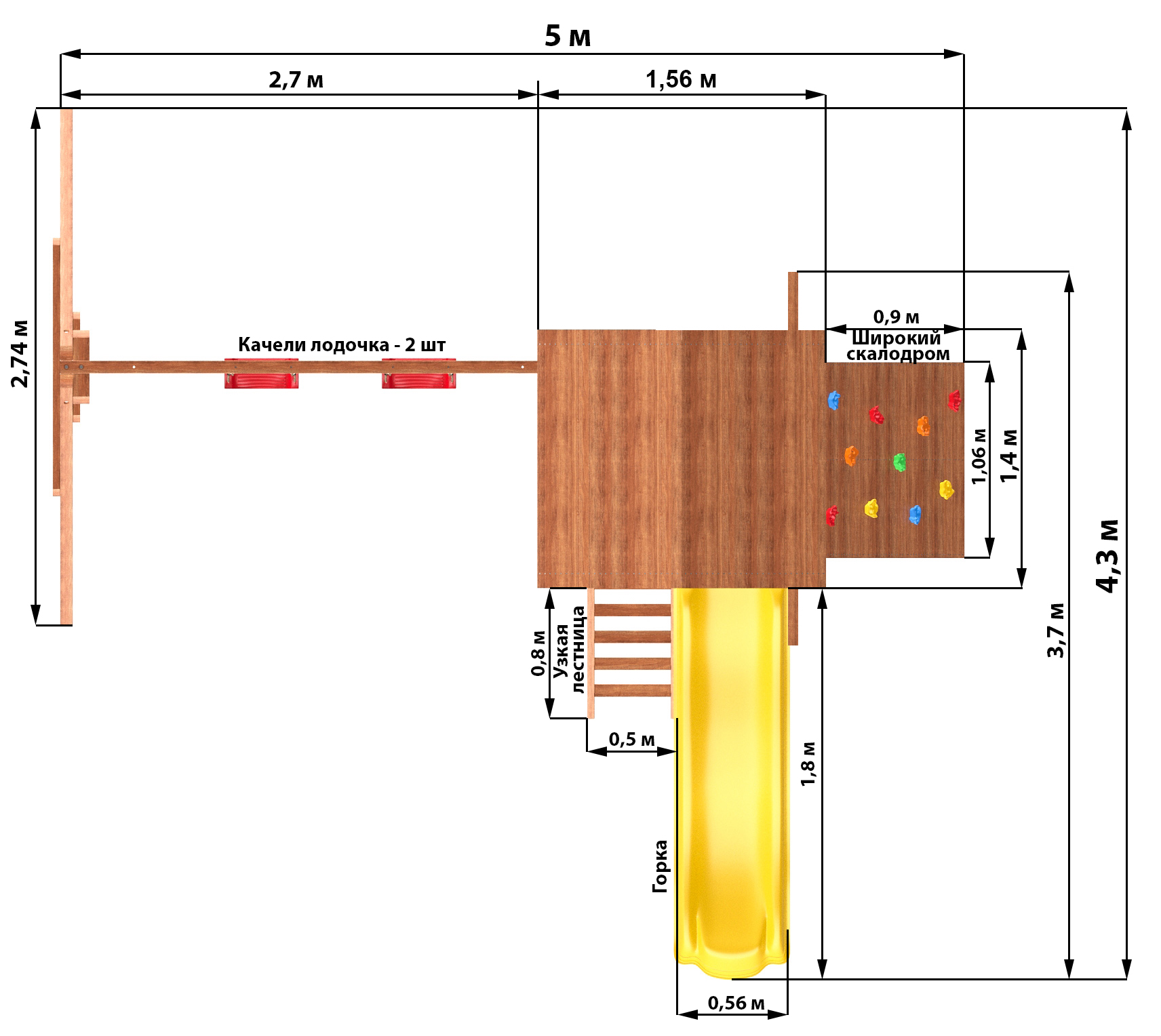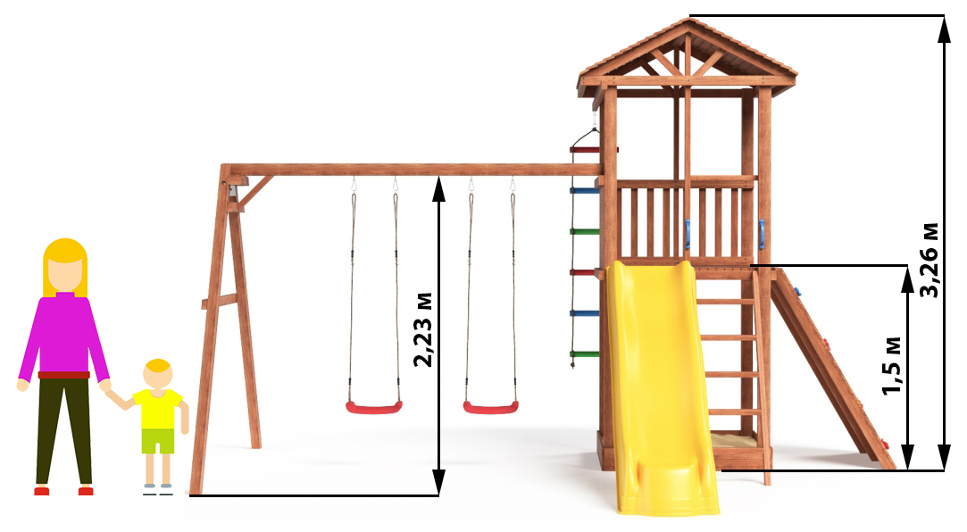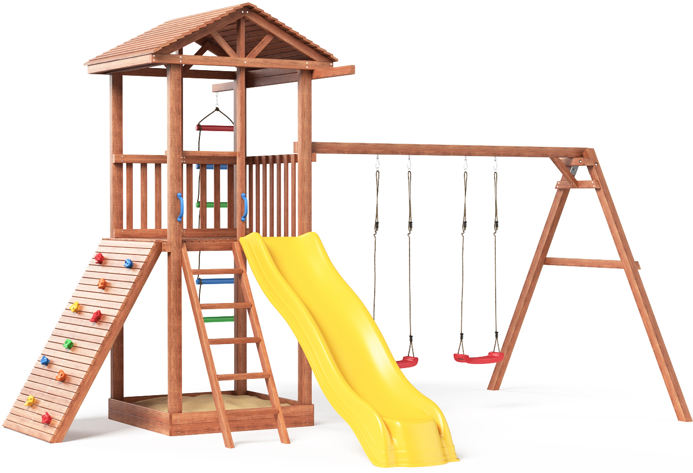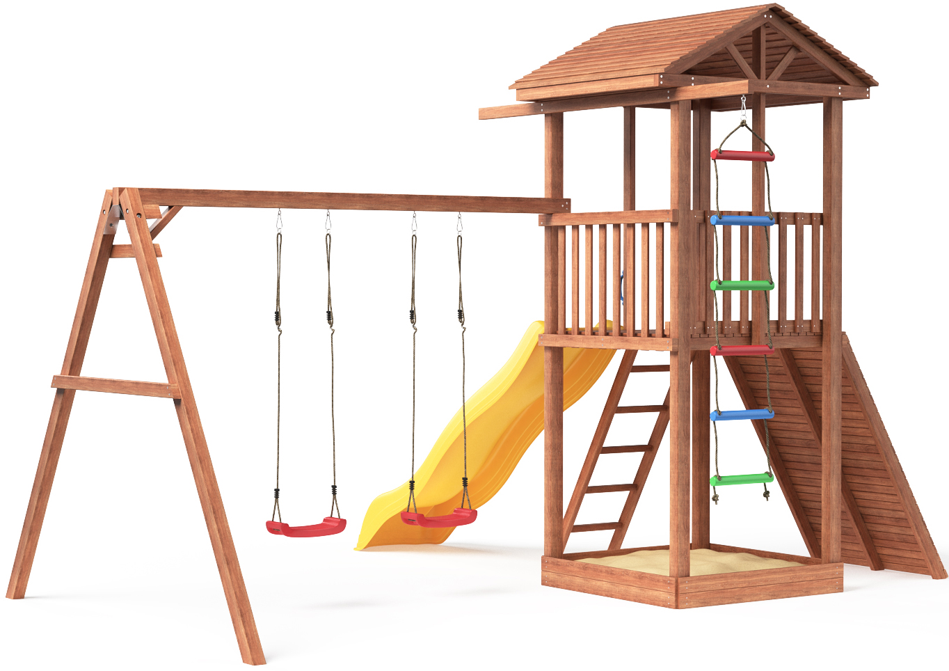 Площадка изготавливается из лесоматериалов лиственных и хвойных пород. Материал имеет естественную древесную текстуру, обработан специальными составами для большего срока использования и предохранения от разрушения древесины. Все элементы проходят предварительную шлифовку - Ваш ребенок никогда не получит заусенцы.