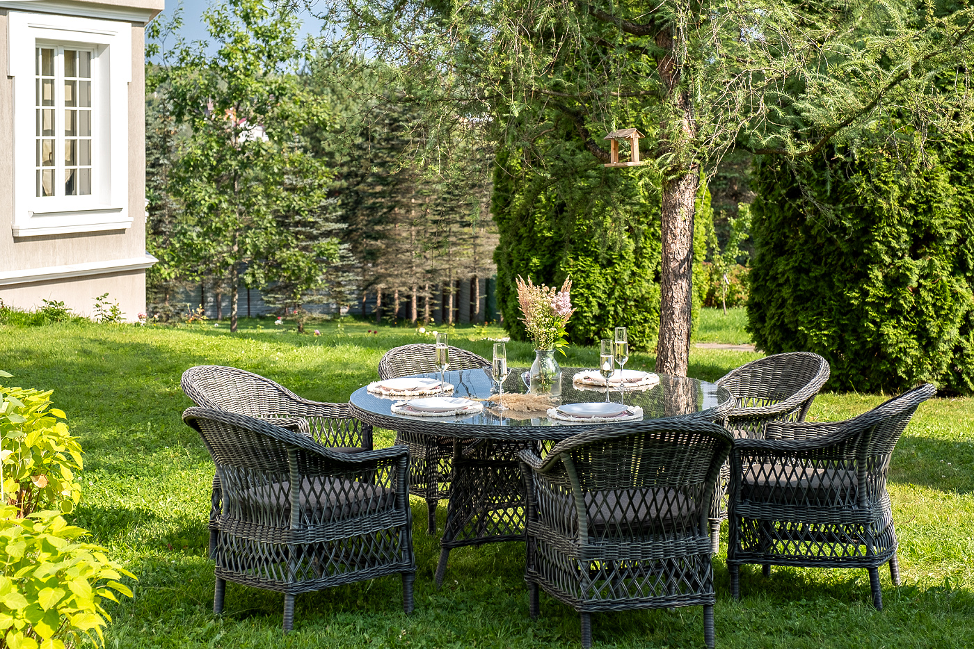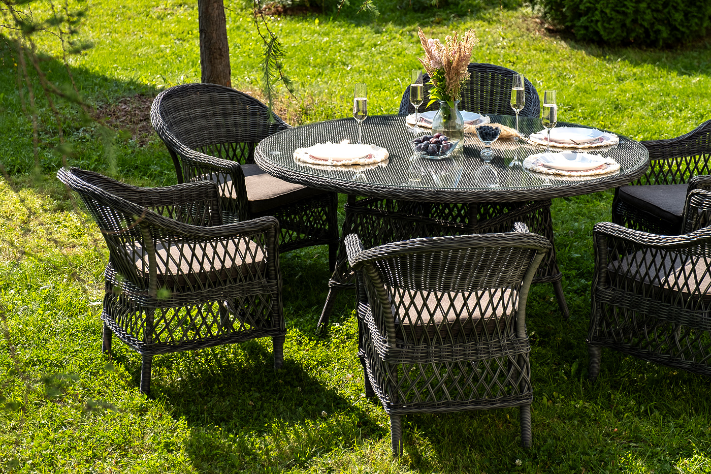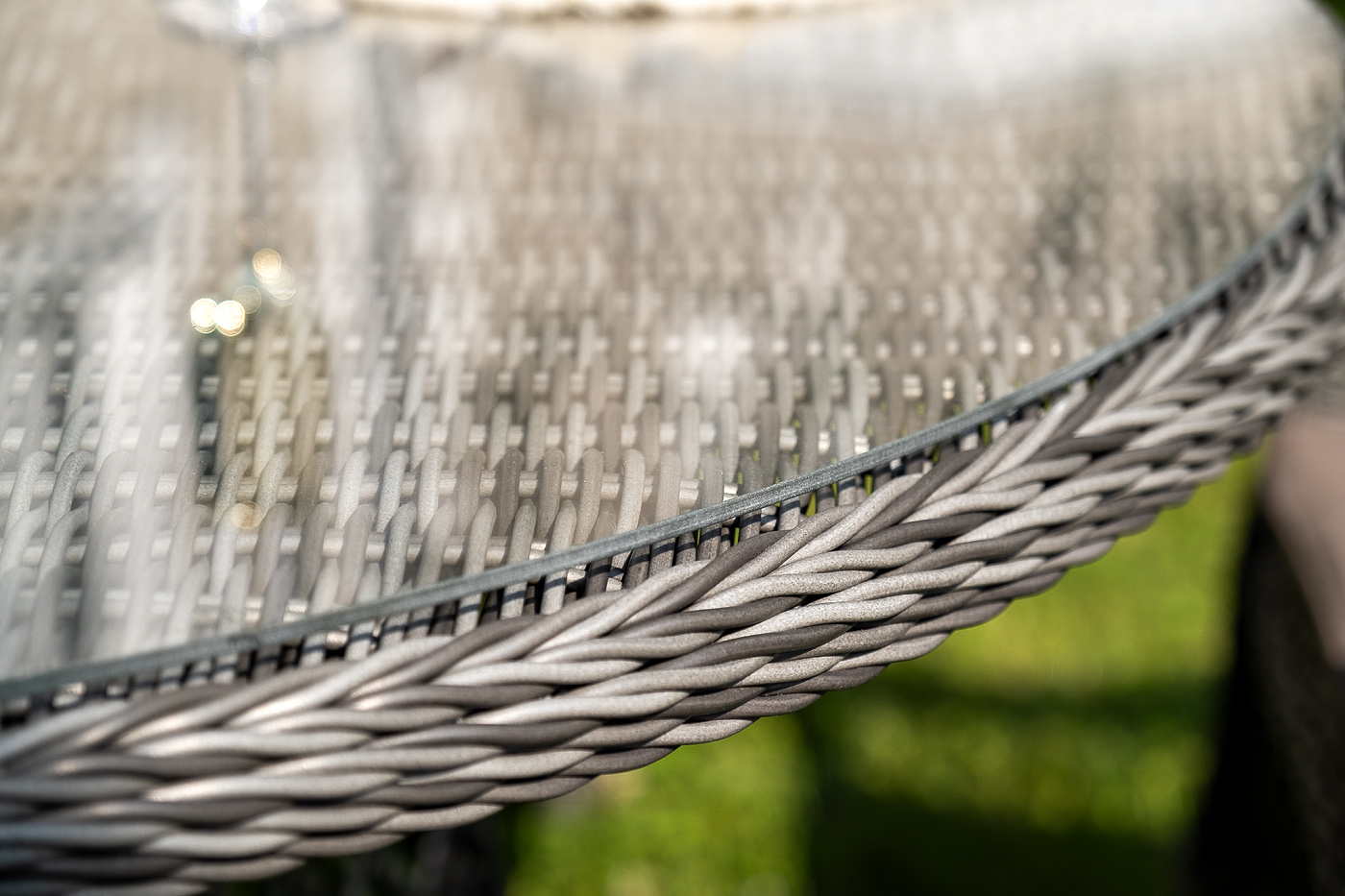 Вся мебель изготовлена из долговечного и легкого алюминия, обтянутого синтетическим ротангом. На столе для удобства эксплуатации предусмотрена столешница из ударопрочного закаленного стекла 5 мм. Стулья укомплектованы подушками на сидениях.