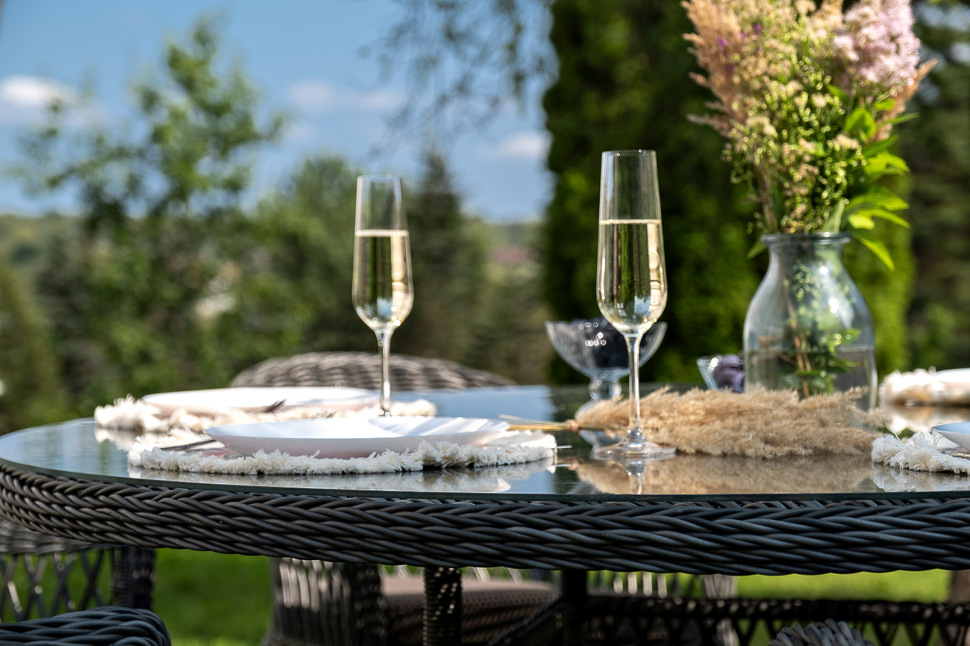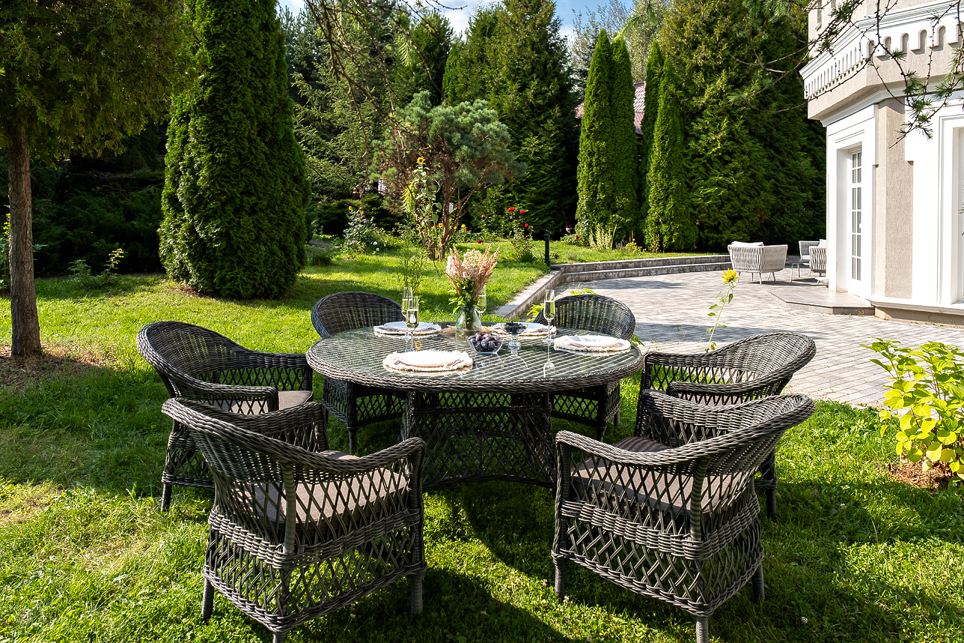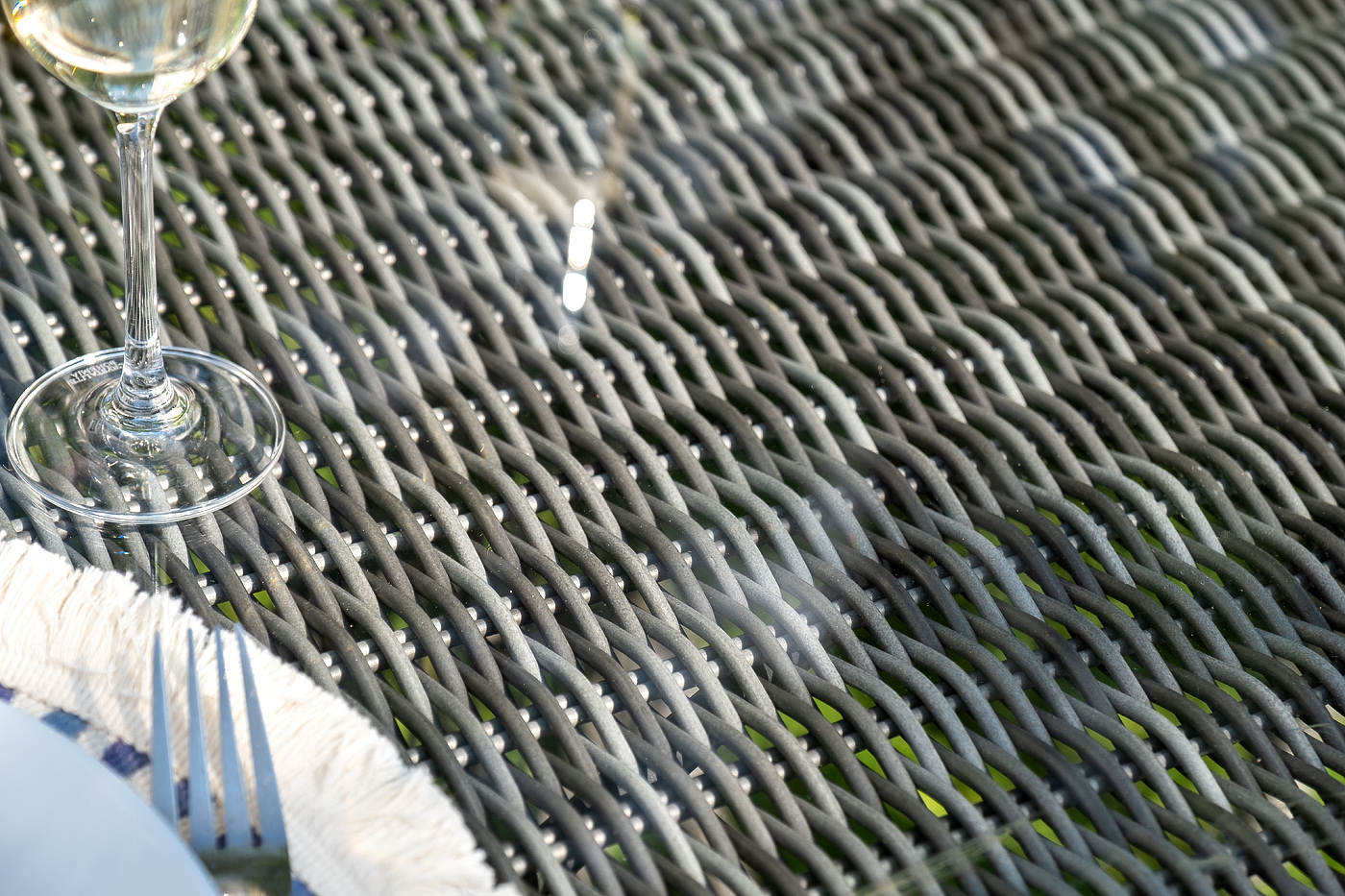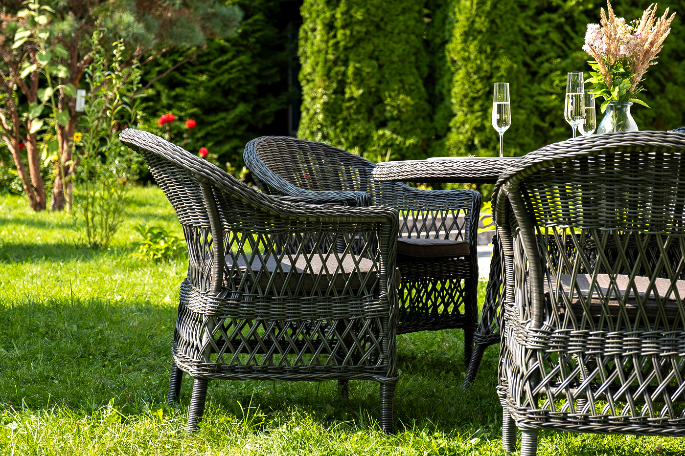 Вся мебель изготовлена из долговечного и легкого алюминия, обтянутого синтетическим ротангом. На столе для удобства эксплуатации предусмотрена столешница из ударопрочного закаленного стекла 5 мм. Стулья укомплектованы подушками на сидениях.