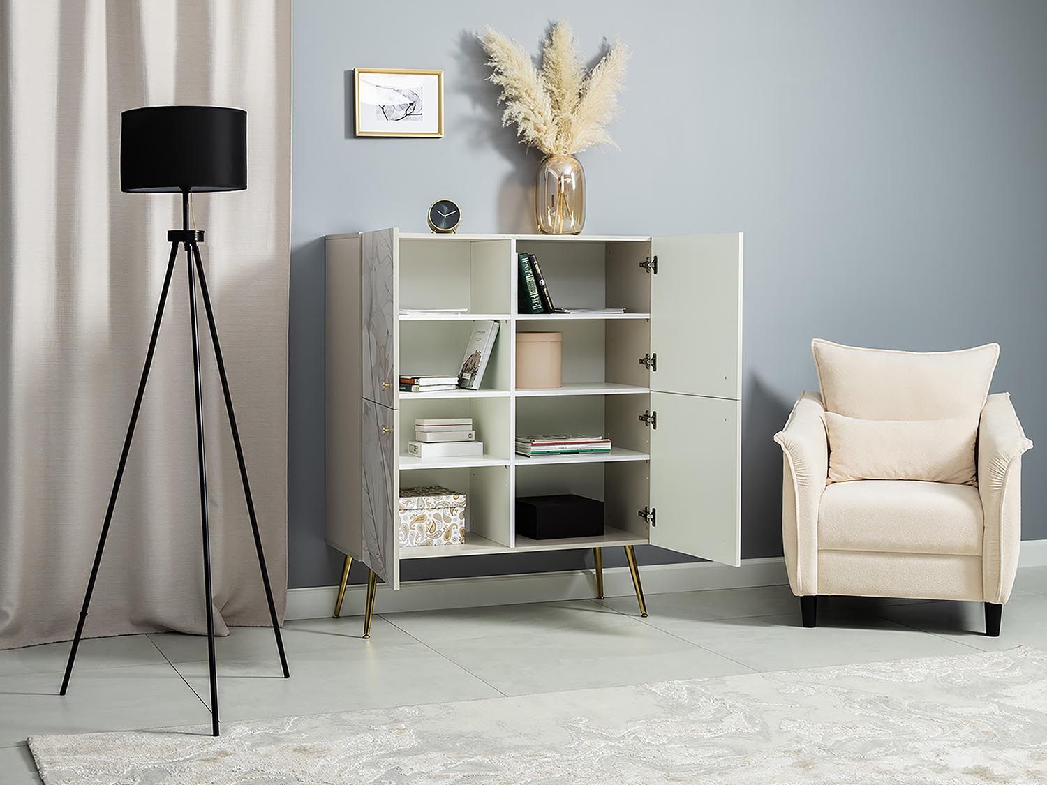 Комод имеет 4-е глухие распашные двери, за которыми по 8-мь полок.