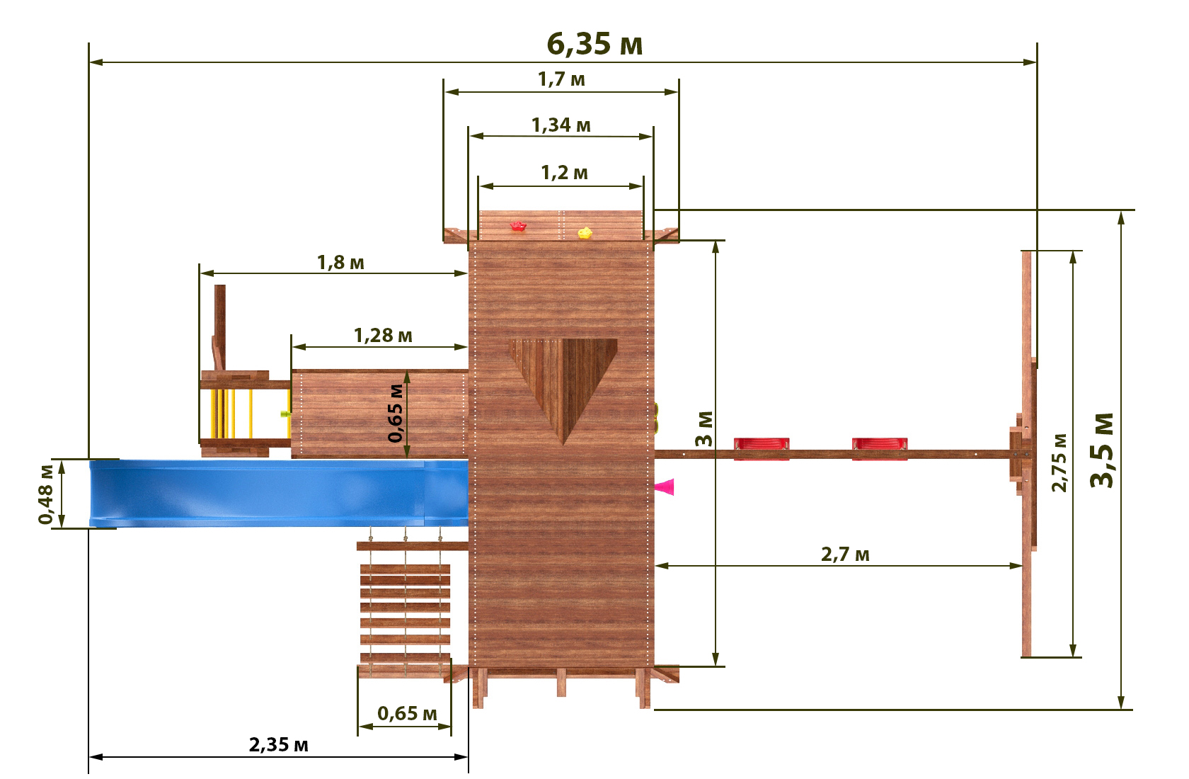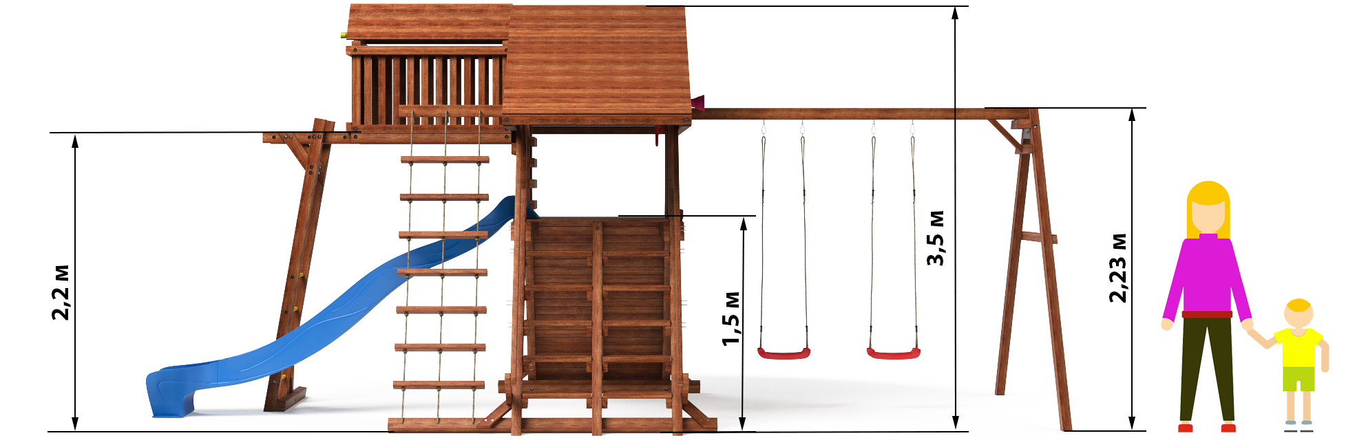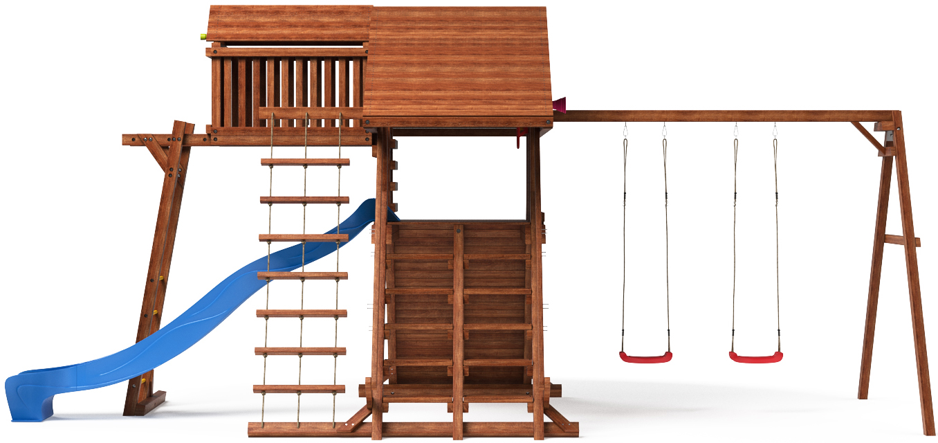 Площадка изготавливается из лесоматериалов лиственных и хвойных пород. Материал имеет естественную древесную текстуру, обработан специальными составами для большего срока использования и предохранения от разрушения древесины. Все элементы проходят предварительную шлифовку - Ваш ребенок никогда не получит заусенцы.