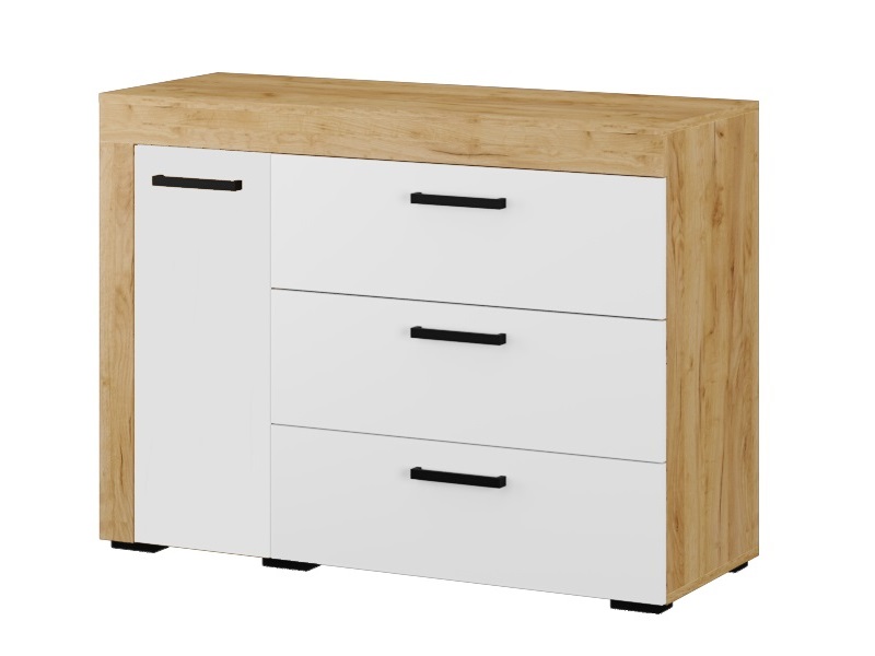 Куда сложить белье, аксессуары и вещи в сложенном виде? Во вместительный комод из коллекции Адель. Корпус модуля выполнен в трендовом декоре с имитацией натурального дерева и дополнен белыми фасадами. Имеет 3 ящика на шариковых направляющих и полку за дверцей. Черная фурнитура добавляет комоду стиля и выглядит эффектно.