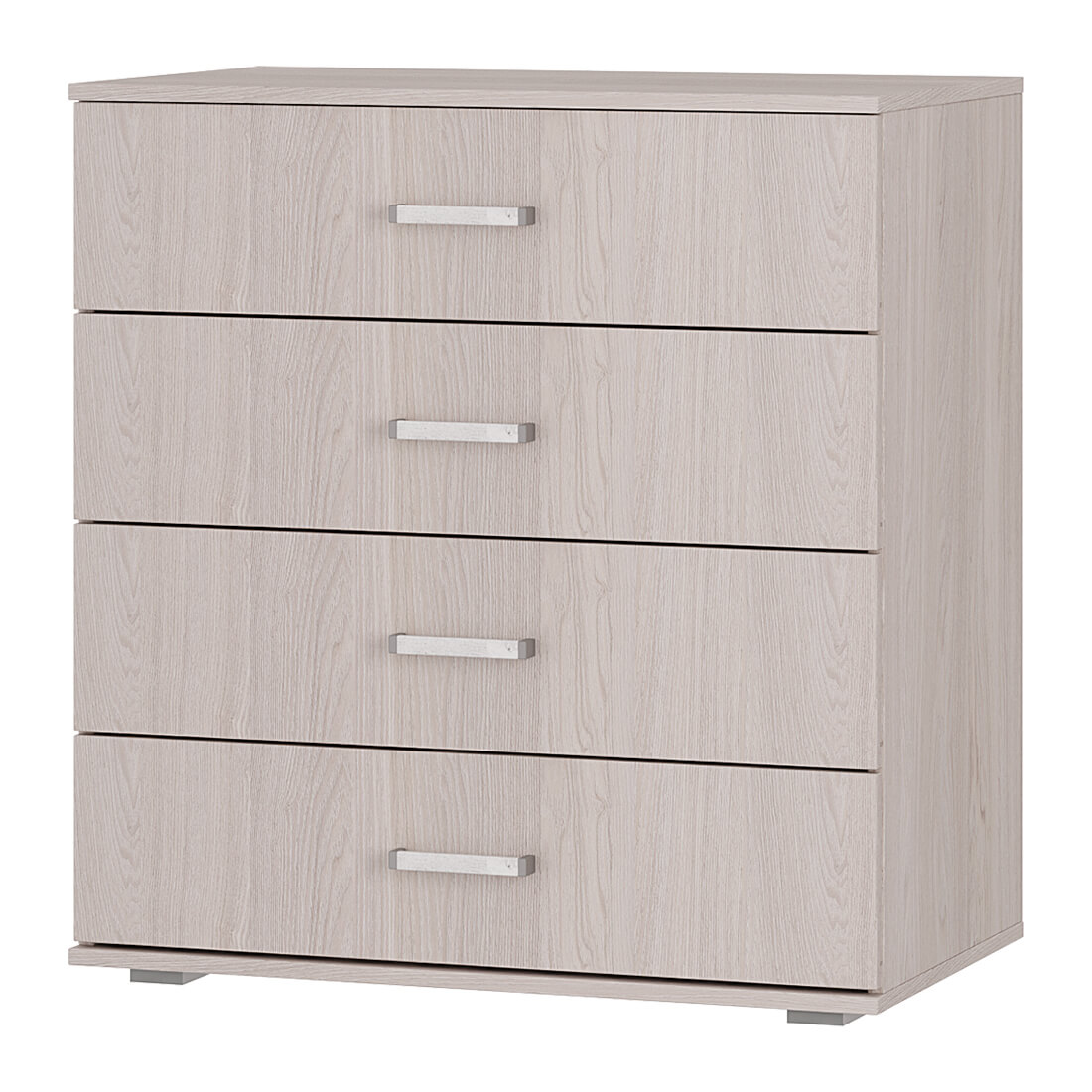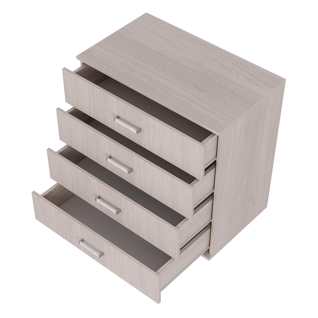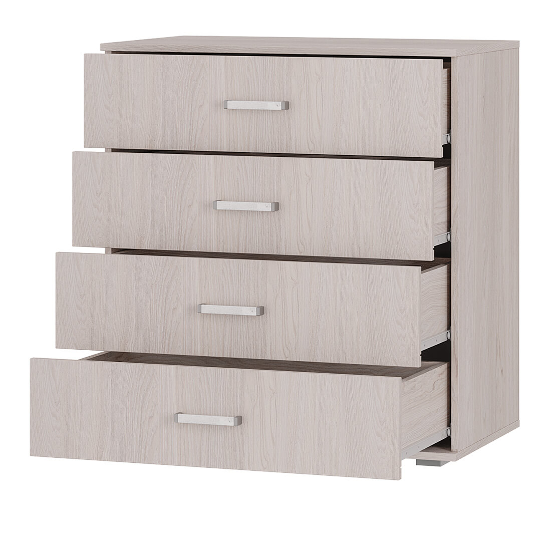 Комод имеет четыре выдвижных ящика, максимальная нагрузка на каждый из которых составляет 10 кг. Благодаря роликовым направляющим ящики открываются легко и бесшумно.