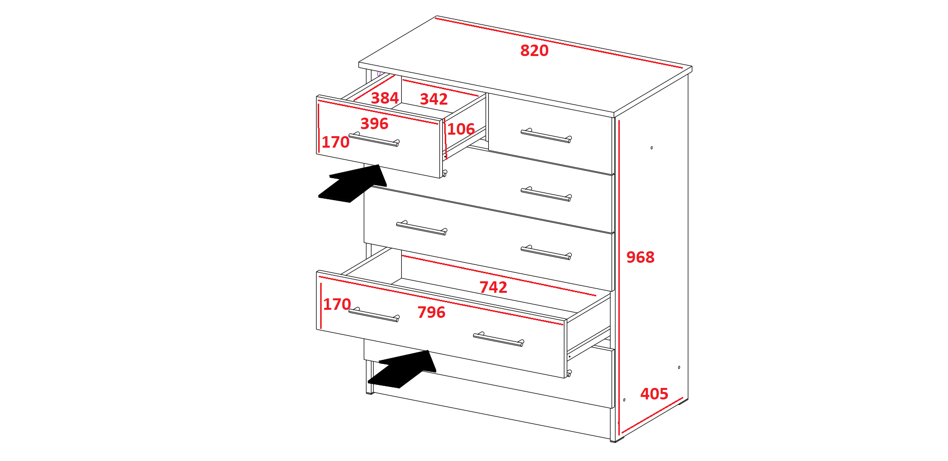 — Максимальная распределенная нагрузка для выдвижных ящиков на дно — 8-10 кг, для верхних маленьких ящиков – 5 кг.