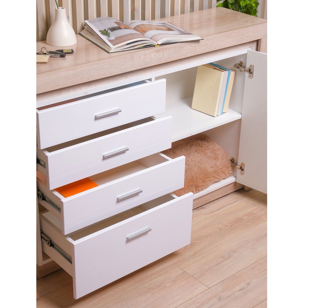 - Корпус ЛДСП 16 мм в декоре «Дуб Сакраменто» и фасад МДФ 16 мм в декоре «Белый снег глянец»