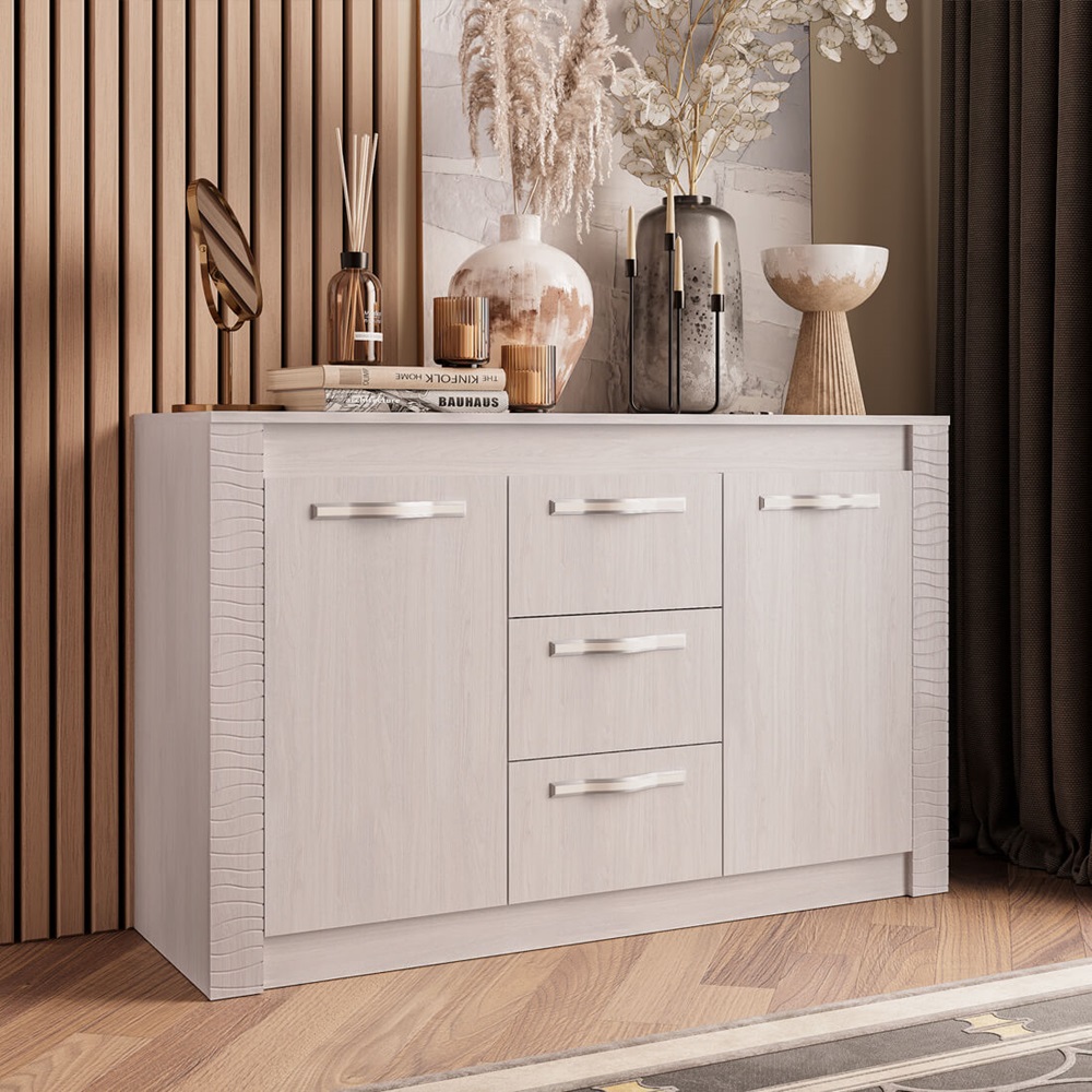 Комод «Монако КМ-14» в цвете «ясень белый F12» — это стильный и функциональный элемент интерьера. Он изготовлен из высококачественных материалов: корпус и фасад — из ЛДСП, а декоративные вставки — из МДФ. Комод имеет три выдвижных ящика и две распашные дверцы.