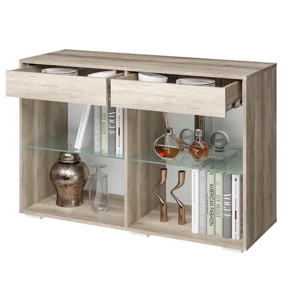 Комод состоит из двух полновыкатных ящиков на направляющих и двух с распашными дверцами, украшенными тонированным стеклом толщиной 4 мм. Стеклянные полки придают лёгкость и воздушность интерьеру.