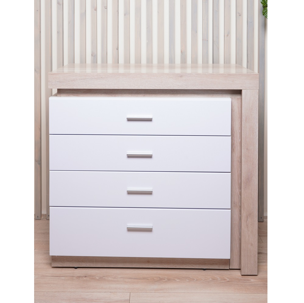 - Корпус ЛДСП 16 мм в декоре «Дуб Сакраменто» и фасад МДФ 16 мм в декоре «Белый снег»