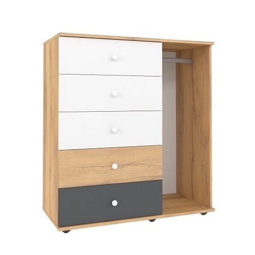 Комод из коллекции Лойс создан с учетом вкуса и потребностей Вашего ребенка! Личные вещи и белье поместятся в 5-ти вместительных ящиках на шариковых направляющих. Открытая ниша имеет просторную штангу, на которой ребенок разместит школьную форму и деликатную одежду на плечиках. Благодаря необычной конструкции комода Вашему чаду будет проще соблюдать порядок в детской без лишних хлопот.