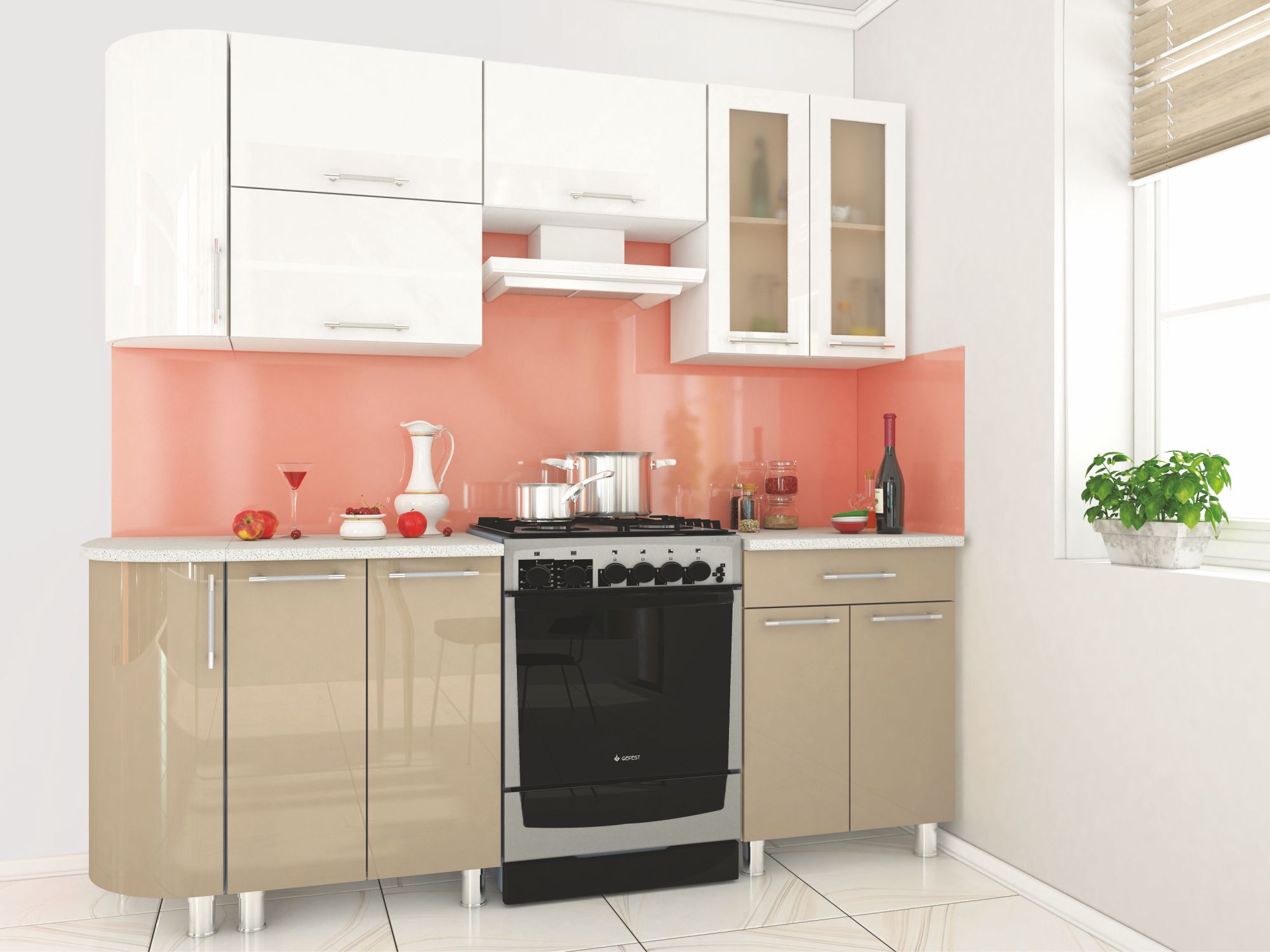 Прямая кухня Танго с закругленными краями в нежном пастельном исполнении — многофункциональная система хранения в стиле модерн для современного интерьера. В этом гарнитуре гармонично сочетаются два нейтральных оттенка, белый и мокко, которые придадут Вашему помещению атмосферу уюта и тепла. Глянцевые фасады, металлические ручки, стилизованные под рейлинги, матовые стеклянные фасады и угловое радиусное завершение создают ощущение единства и законченности.