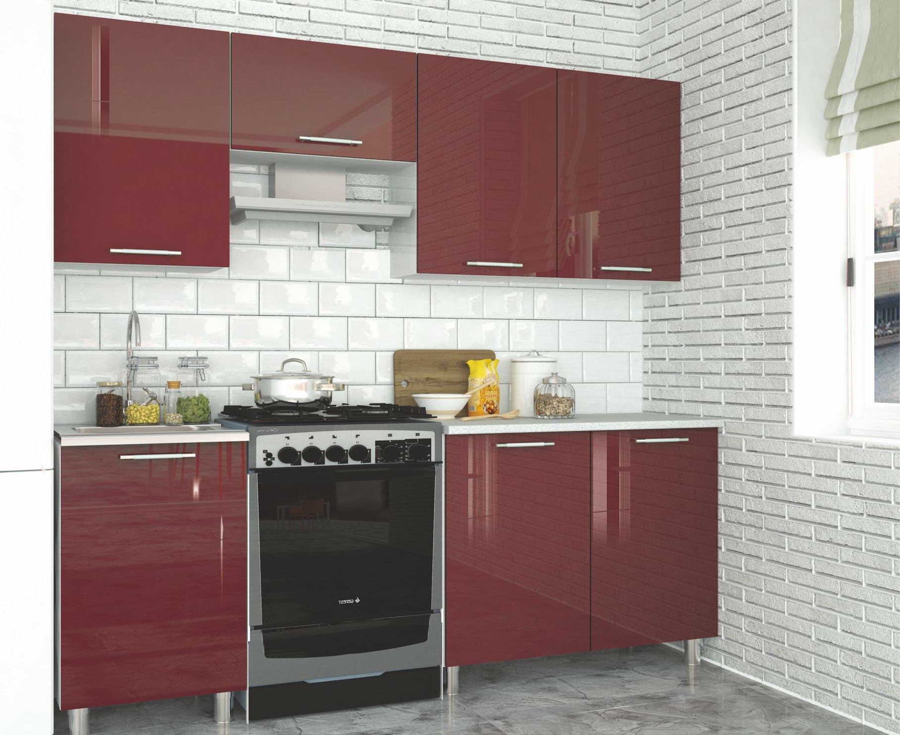Прямая компактная кухня «Танго» шириной 1500 мм идеально подходит для небольших по площади помещений, поэтому пользуется большой популярностью в однокомнатных квартирах и квартирах-студиях. Глянцевые фасады, яркое цветовое решение в оттенке «Бордо» и металлические ручки, стилизованные под рейлинги — идеальный вариант гарнитура в стиле модерн.Лаконичный дизайн и простые прямые линии отлично впишутся в современный интерьер Вашей квартиры, а насыщенный бордовый цвет станет ярким акцентом помещения. Три напольных модуля шириной 500 мм каждый позволят Вам организовать комфортную рабочую зону, используя при этом минимум места. Верхние навесные шкафы сочетают в себе вертикальные и горизонтальный модули, в которых найдется место для сушки под посуду и вместительных полок для хранения продуктов и кухонных принадлежностей.