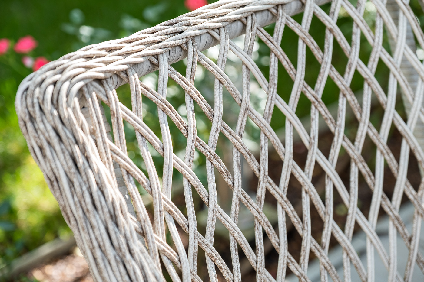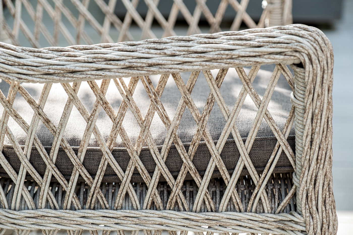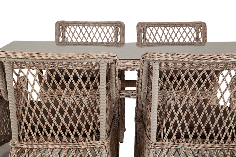Комплект гармонично сочетает в себе алюминий, из которого выполнен каркас и декор из искусственного ротанга бежевого оттенка. Прекрасным дополнением мебели стали мягкие подушки из всепогодной ткани со съёмными чехлами.