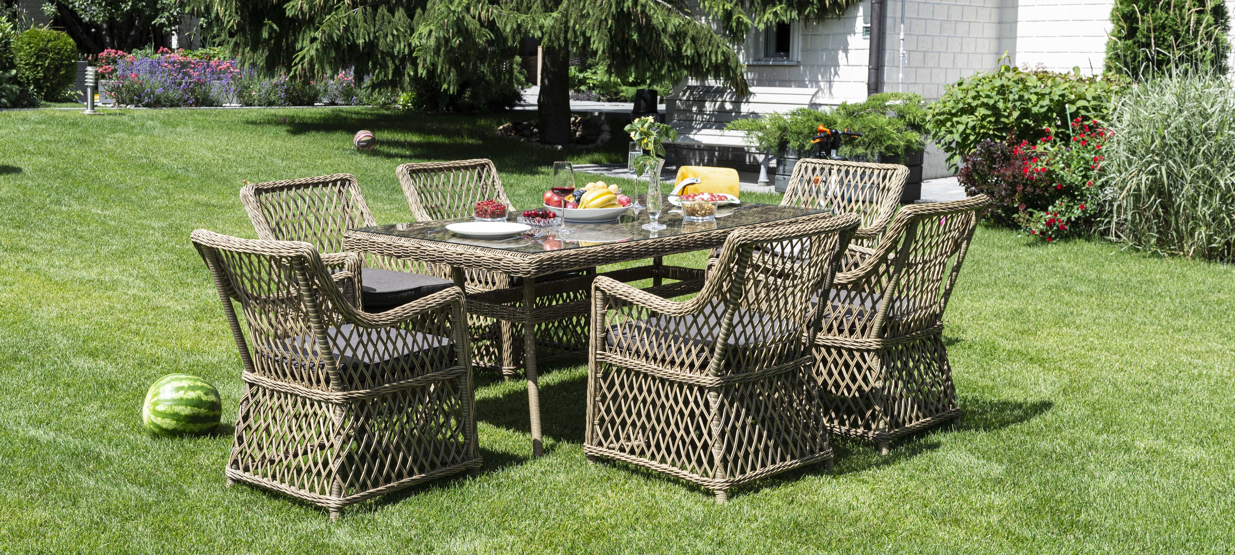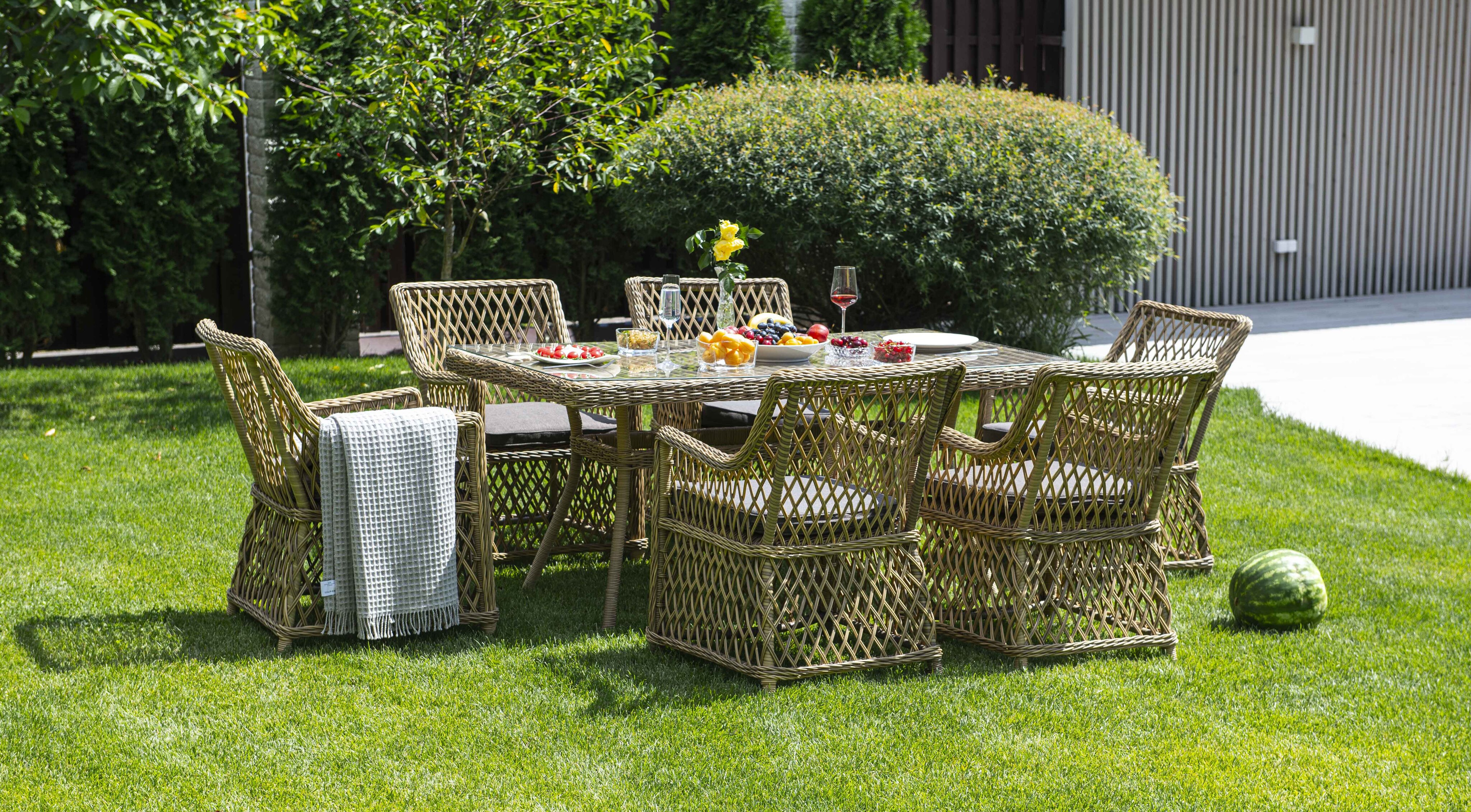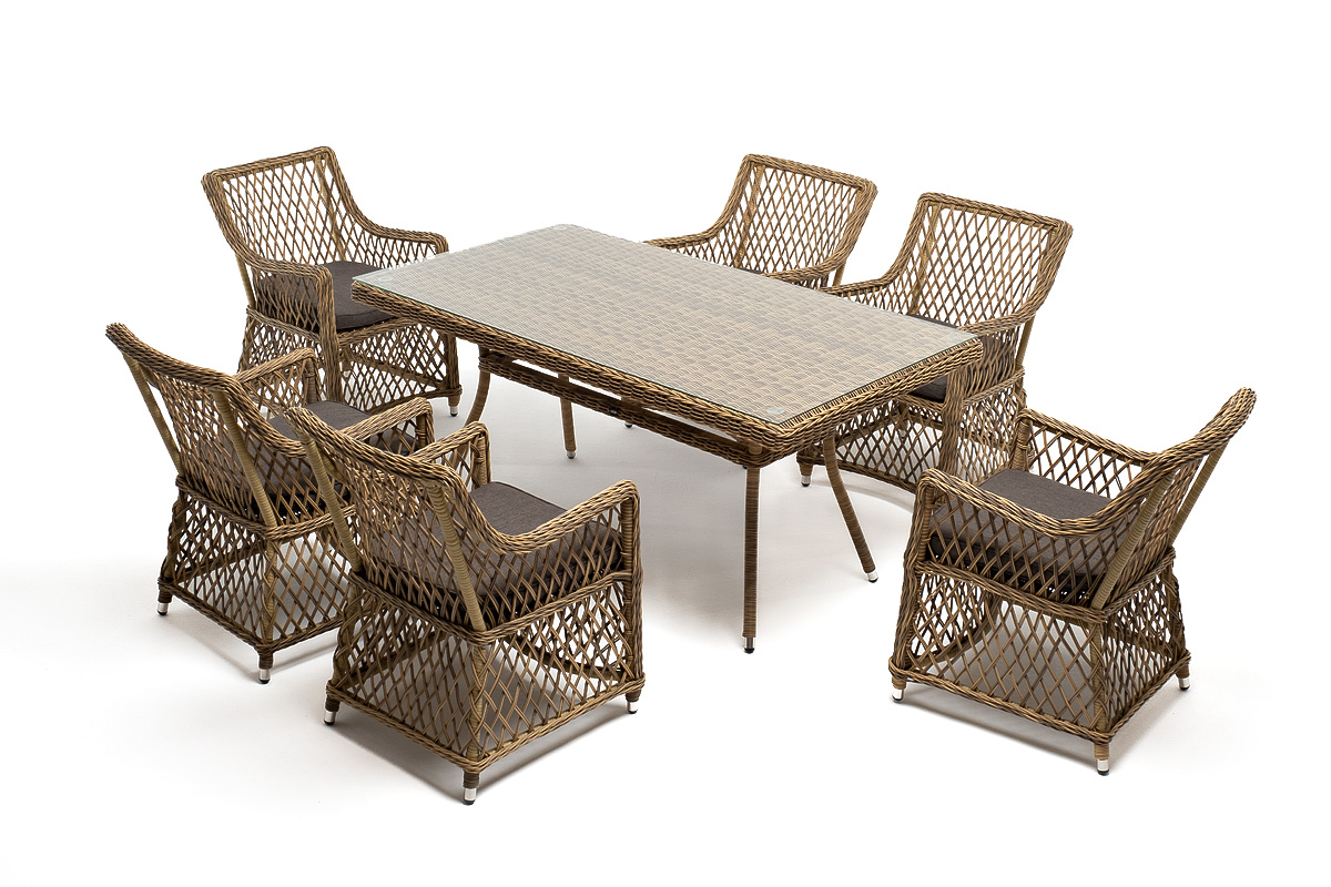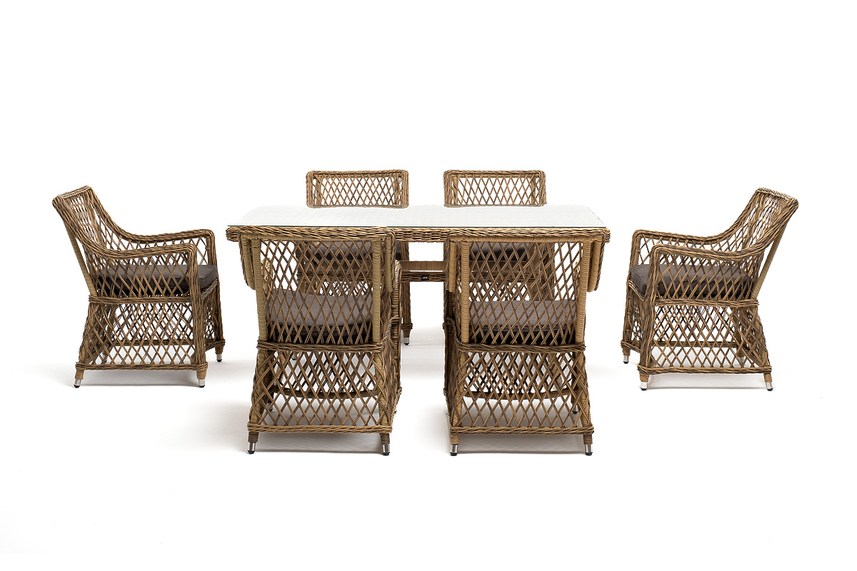 Элитная обеденная группа «Латте» для обустройства зоны отдыха на открытом пространстве. В комплекте прямоугольный обеденный стол 1600×900×750 мм и 6 кресел 550×660×850 мм.