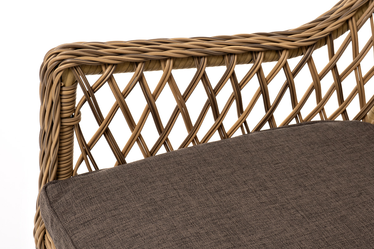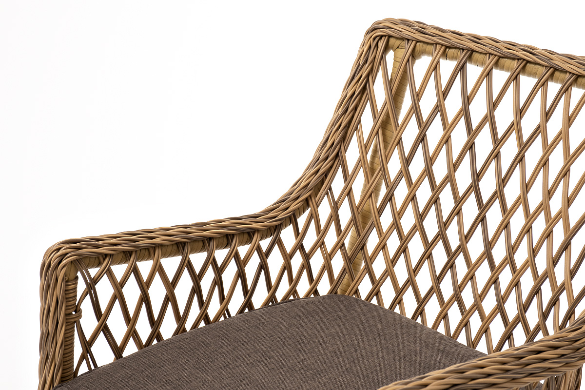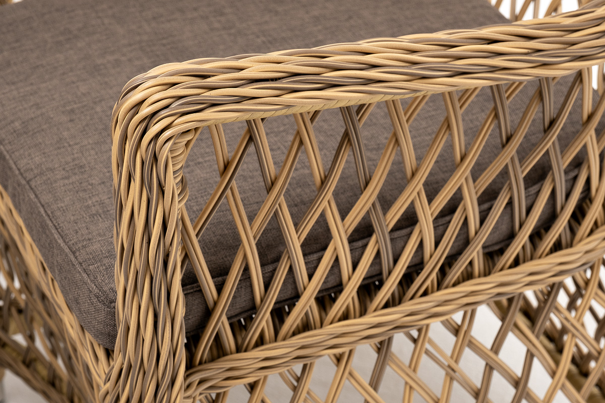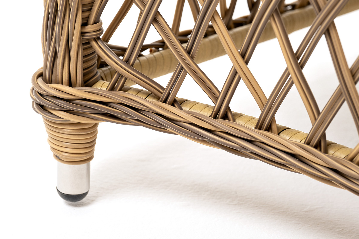 Каркас мебели изготовлен из прочного алюминия и задекорирован синтетическим искусственным ротангом натурального соломенного оттенка. Материал устойчив к ультрафиолетовому излучению. Кресла оснащены мягкими подушками со съёмными чехлами.