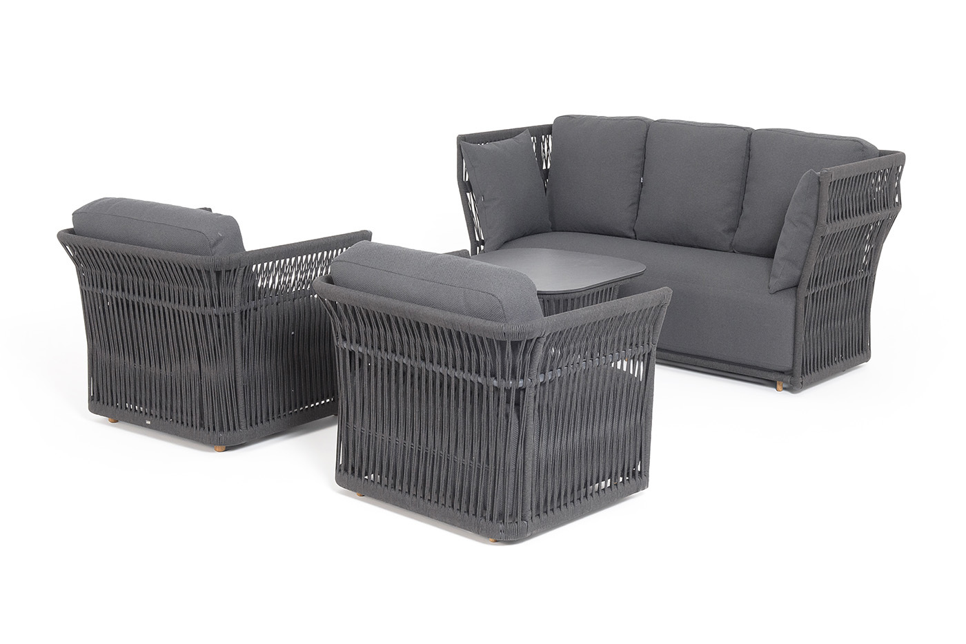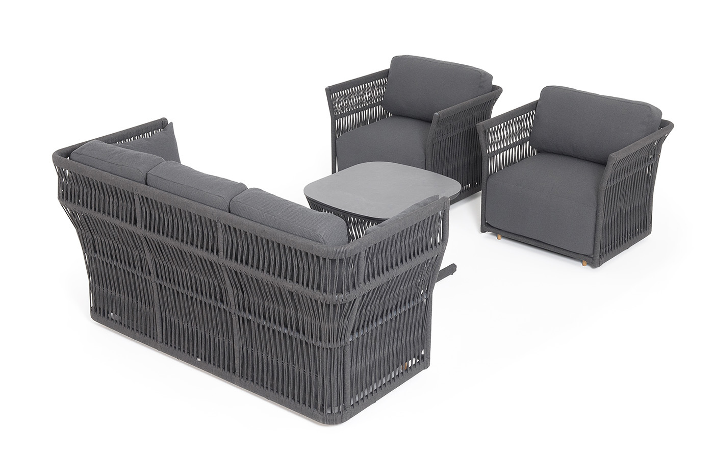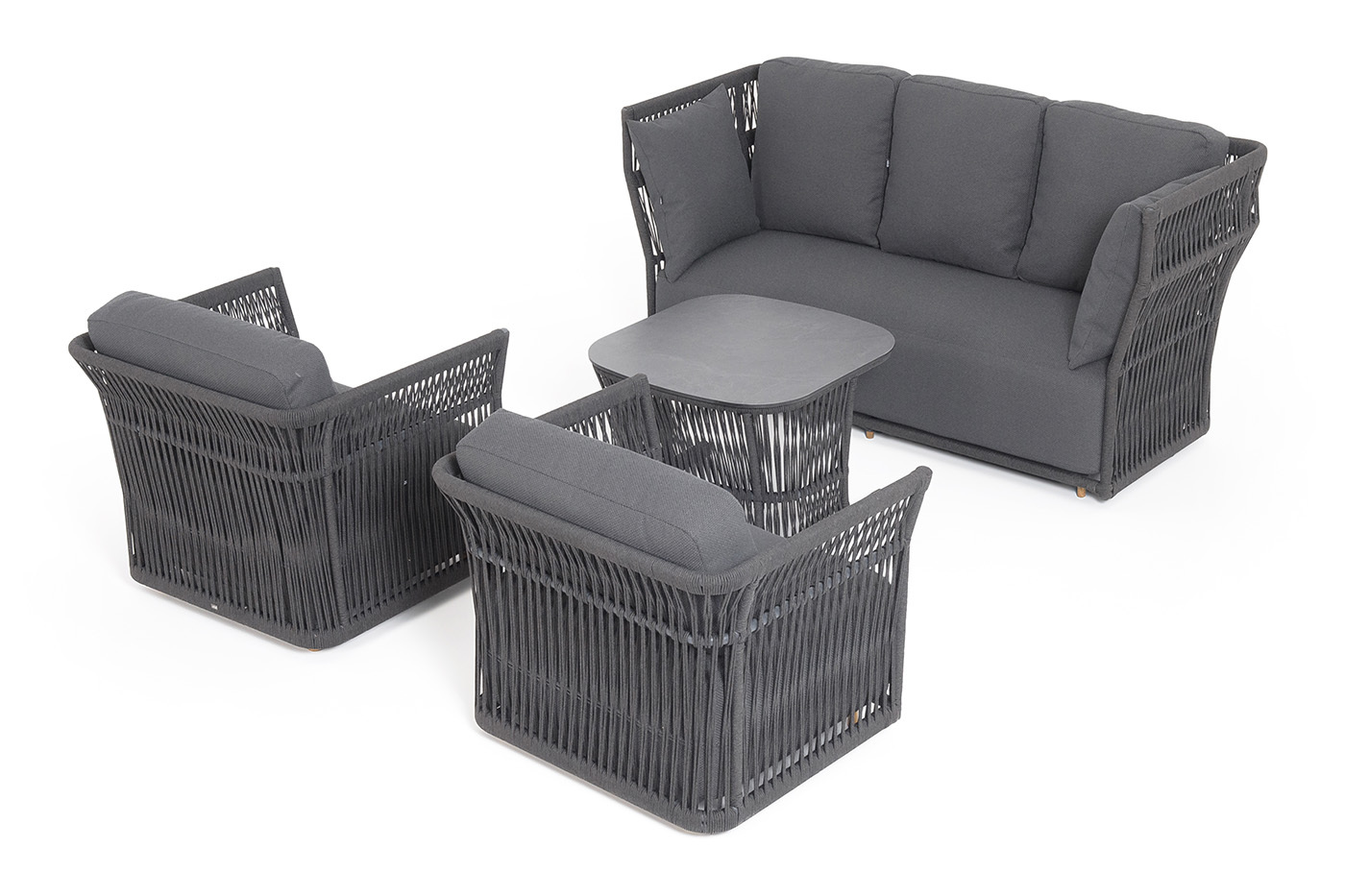 К "Лугано" диван 3-местный плетеный из роупа, каркас алюминий темно-серый (RAL7024) муар, роуп темно-серый круглый, ткань темно-серая YB25-0027 1шт. 2 020Х820Х990, "Лугано" журнальный стол 76х76 H55 см из HPL, цвет "серый гранит" 1шт. 760Х760Х550, "Лугано" кресло плетеное из роупа, каркас алюминий темно-серый (RAL7024) муар, роуп темно-серый круглый, ткань темно-серая YB25-0027 2шт. 980Х820Х770,