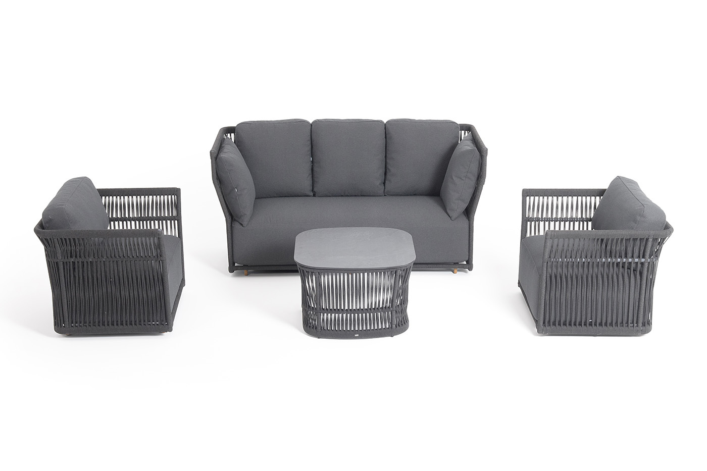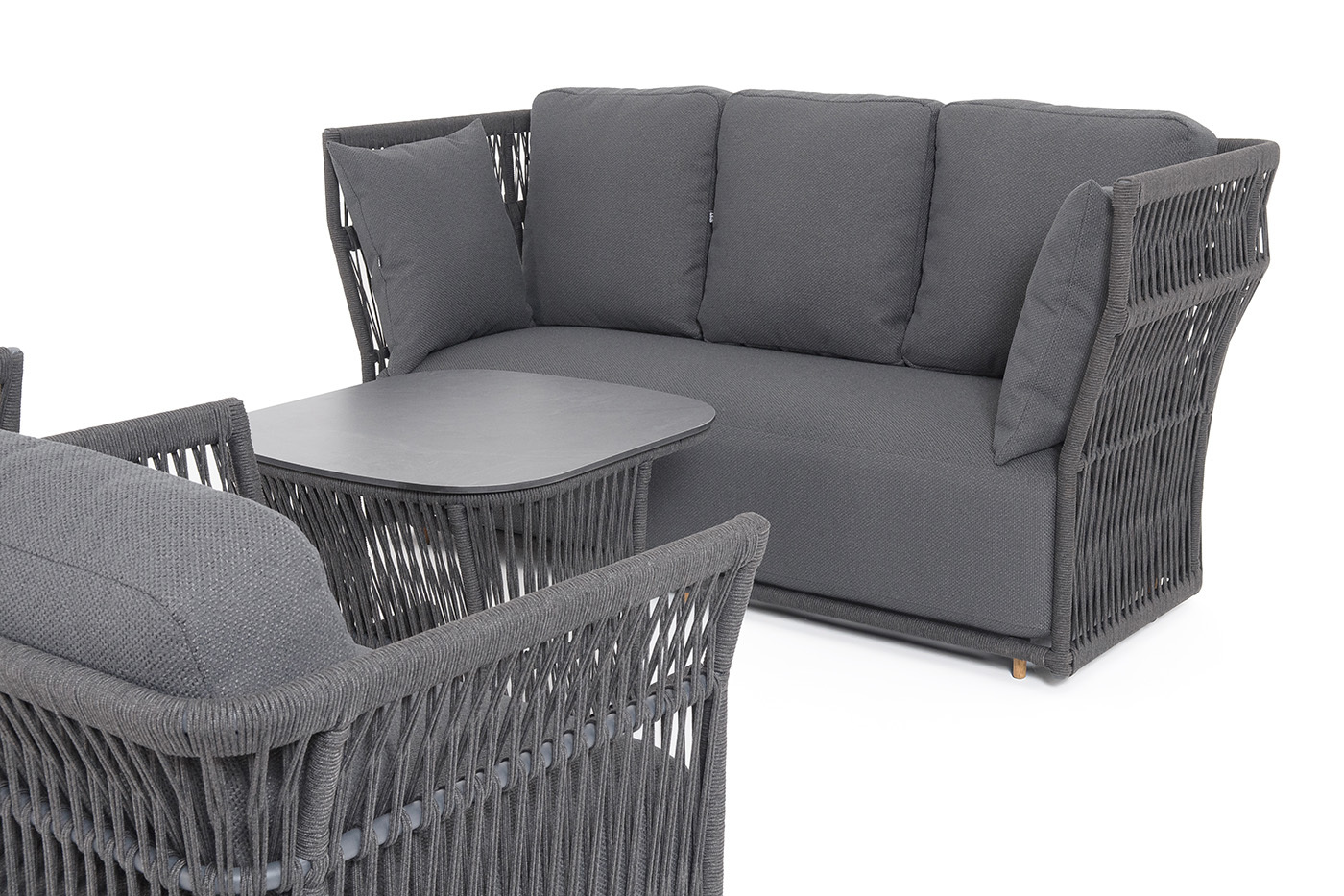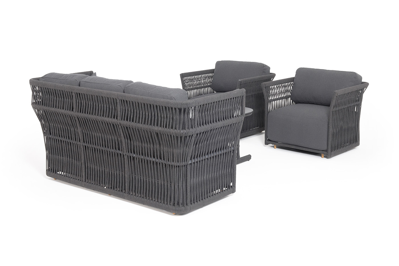 К "Лугано" диван 3-местный плетеный из роупа, каркас алюминий темно-серый (RAL7024) муар, роуп темно-серый круглый, ткань темно-серая YB25-0027 1шт. 2 020Х820Х990, "Лугано" журнальный стол 76х76 H55 см из HPL, цвет "серый гранит" 1шт. 760Х760Х550, "Лугано" кресло плетеное из роупа, каркас алюминий темно-серый (RAL7024) муар, роуп темно-серый круглый, ткань темно-серая YB25-0027 2шт. 980Х820Х770,