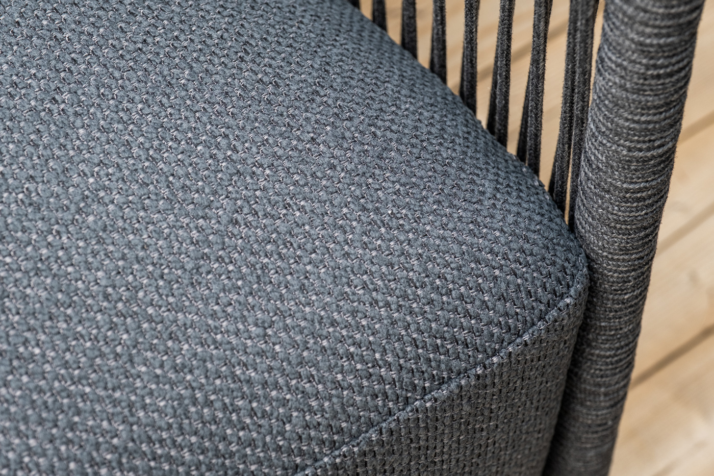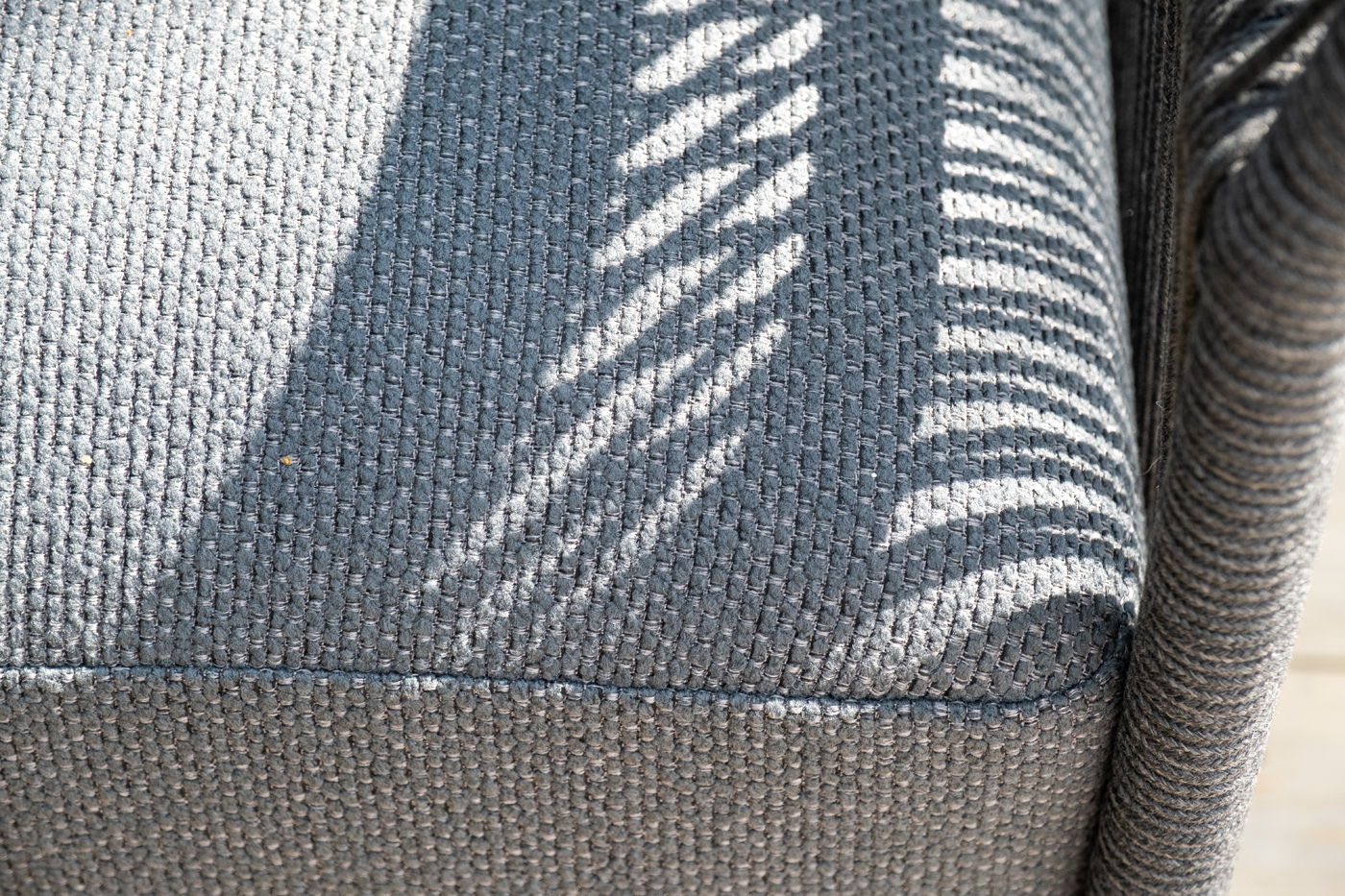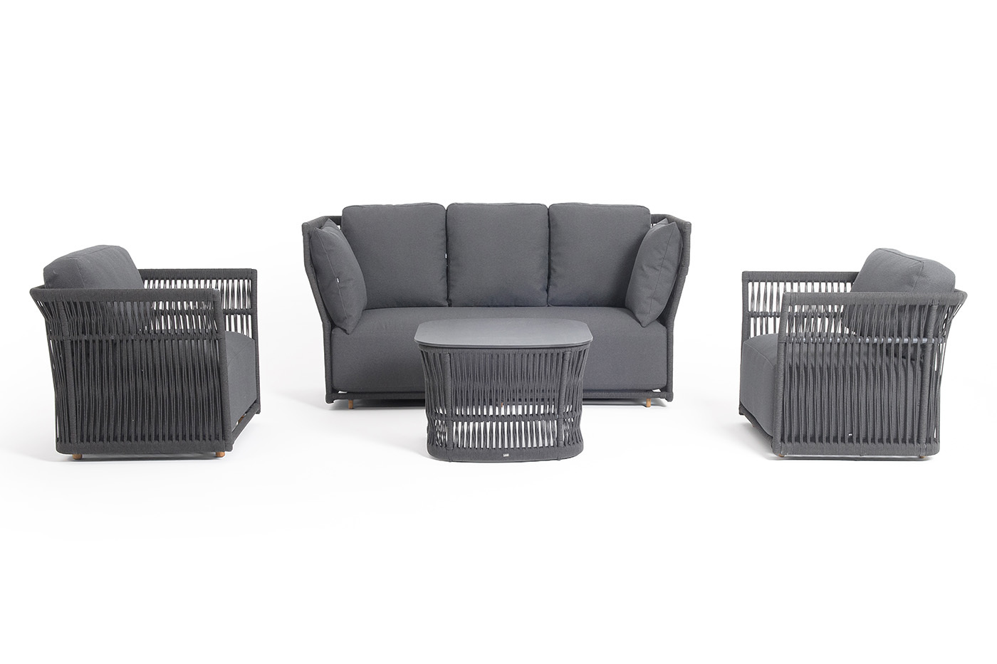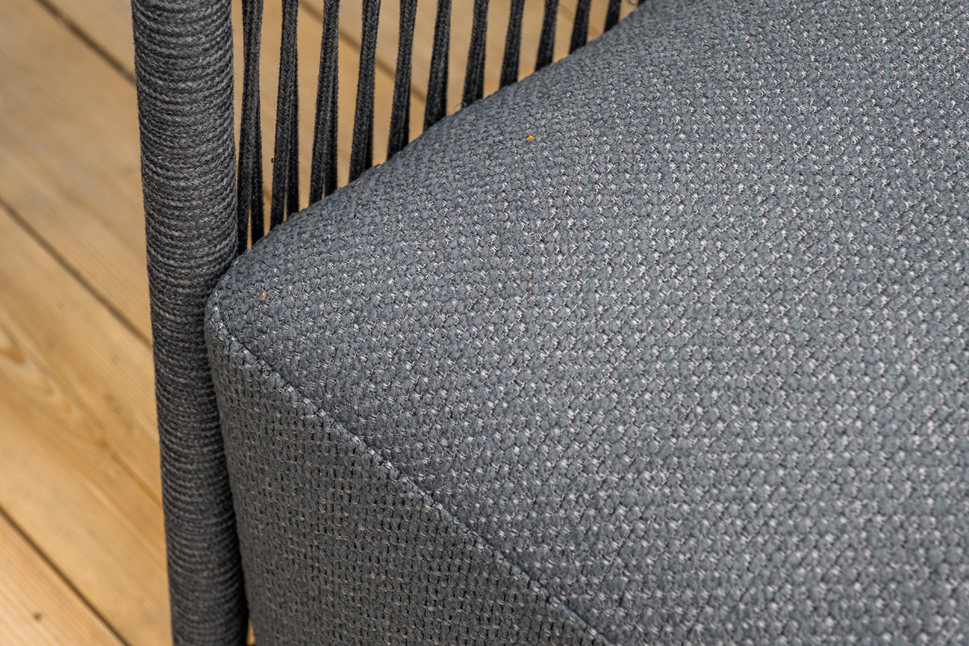 Каркас уличной мебели выполнен из износостойкого алюминия. Его дополняет темно-серая ручная оплетка, изготовленная на основе эластичных синтетических лент из полиэфирных волокон высокой прочности (роупа). На ножках дивана и кресел идут дубовые наконечники (заглушки).