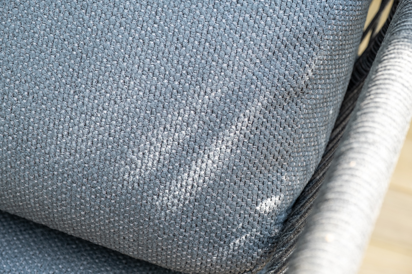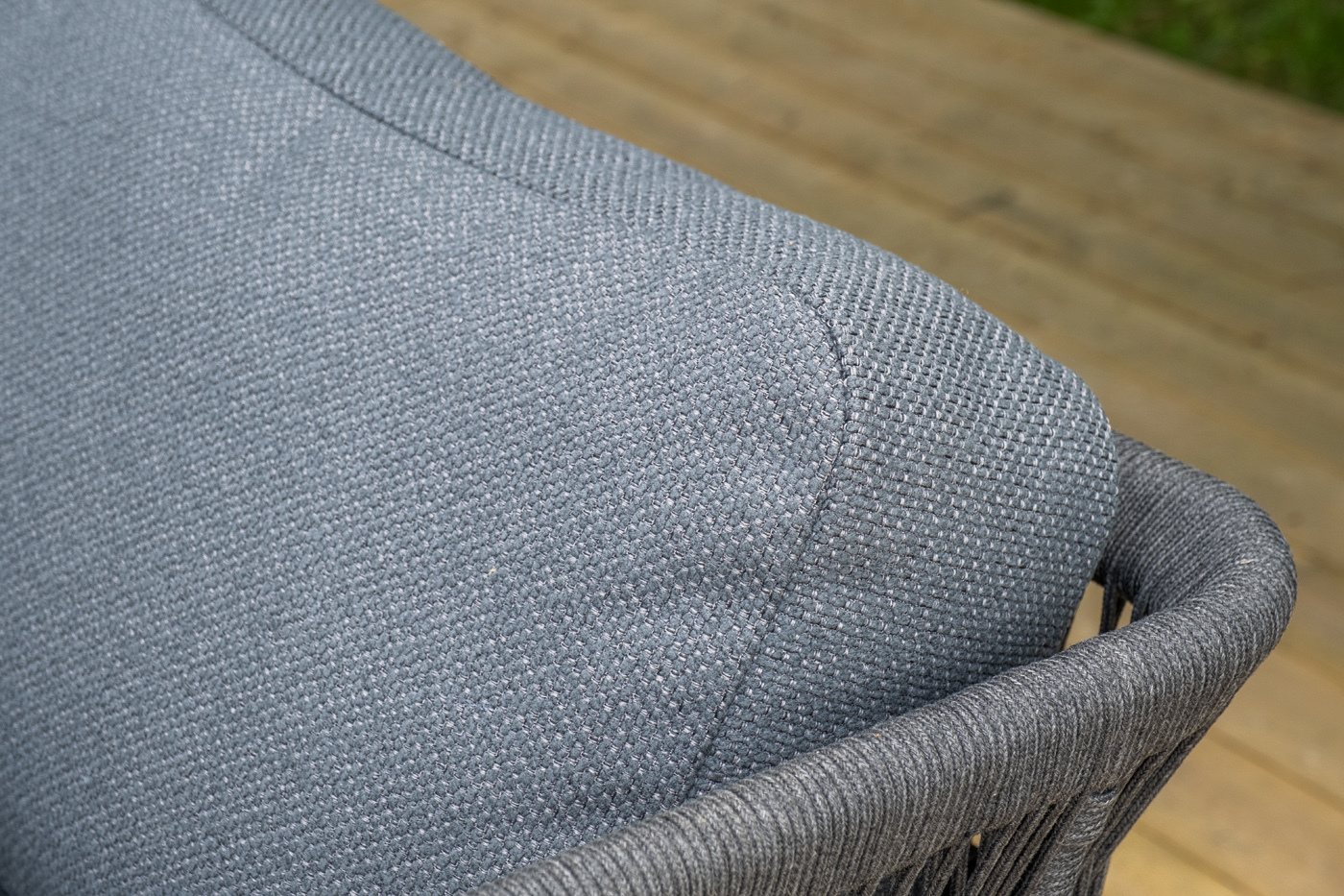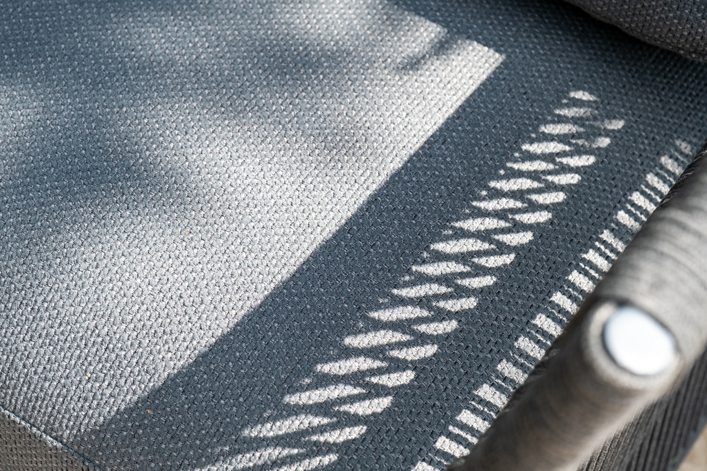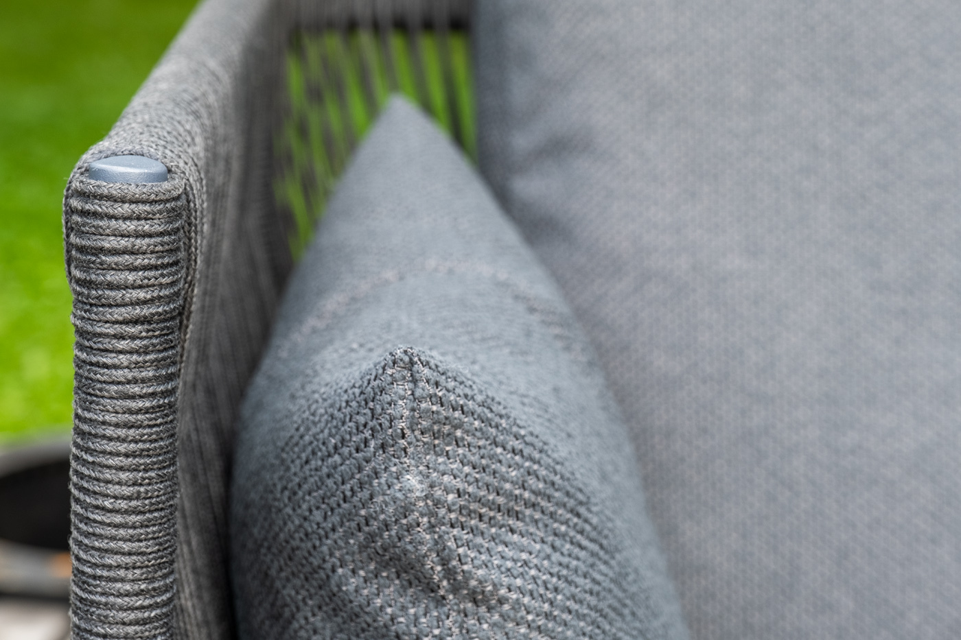 Каркас уличной мебели выполнен из износостойкого алюминия. Его дополняет темно-серая ручная оплетка, изготовленная на основе эластичных синтетических лент из полиэфирных волокон высокой прочности (роупа). На ножках дивана и кресел идут дубовые наконечники (заглушки).