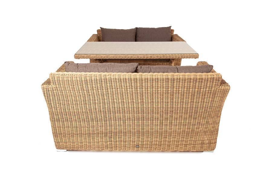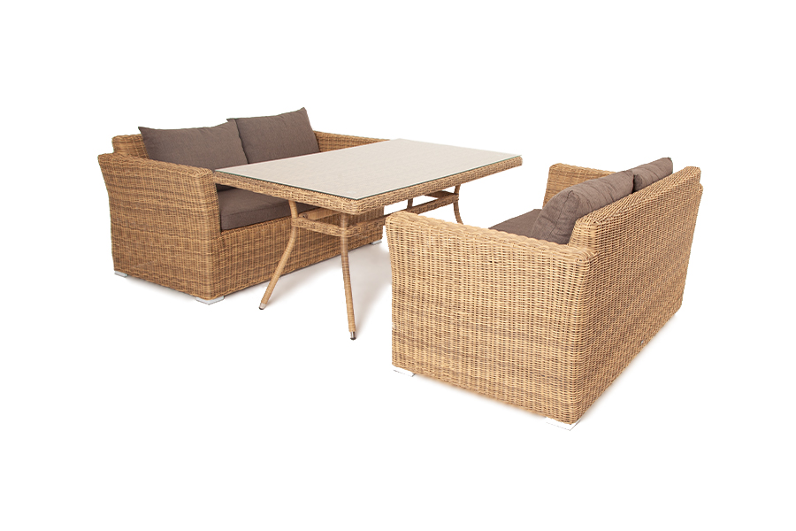 Конструкция мебели изготовлена из алюминия, вручную оплетенного синтетической лозой, имитирующей натуральный ротанг. На сидениях и спинках диванов предусмотрены подушки из полиэфирной ткани с влагоотталкивающе "Латте" плетеный стол из искусственного ротанга 160х90см, цвет соломенный 1шт. 1 600Х900Х750, "Капучино" диван из искусственного ротанга двухместный, цвет соломенный 2шт. 1 700Х865Х815,