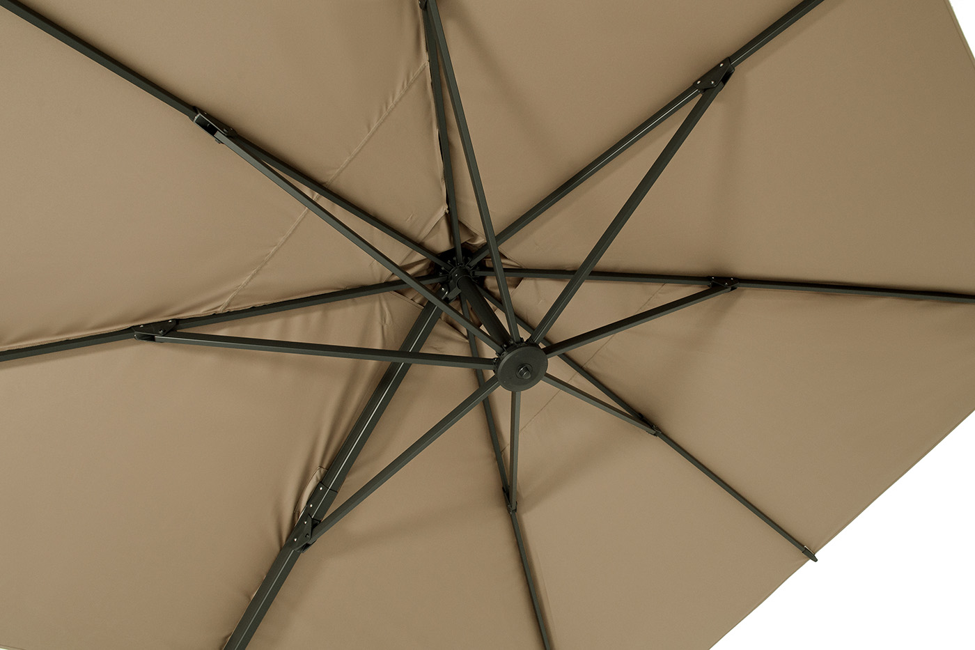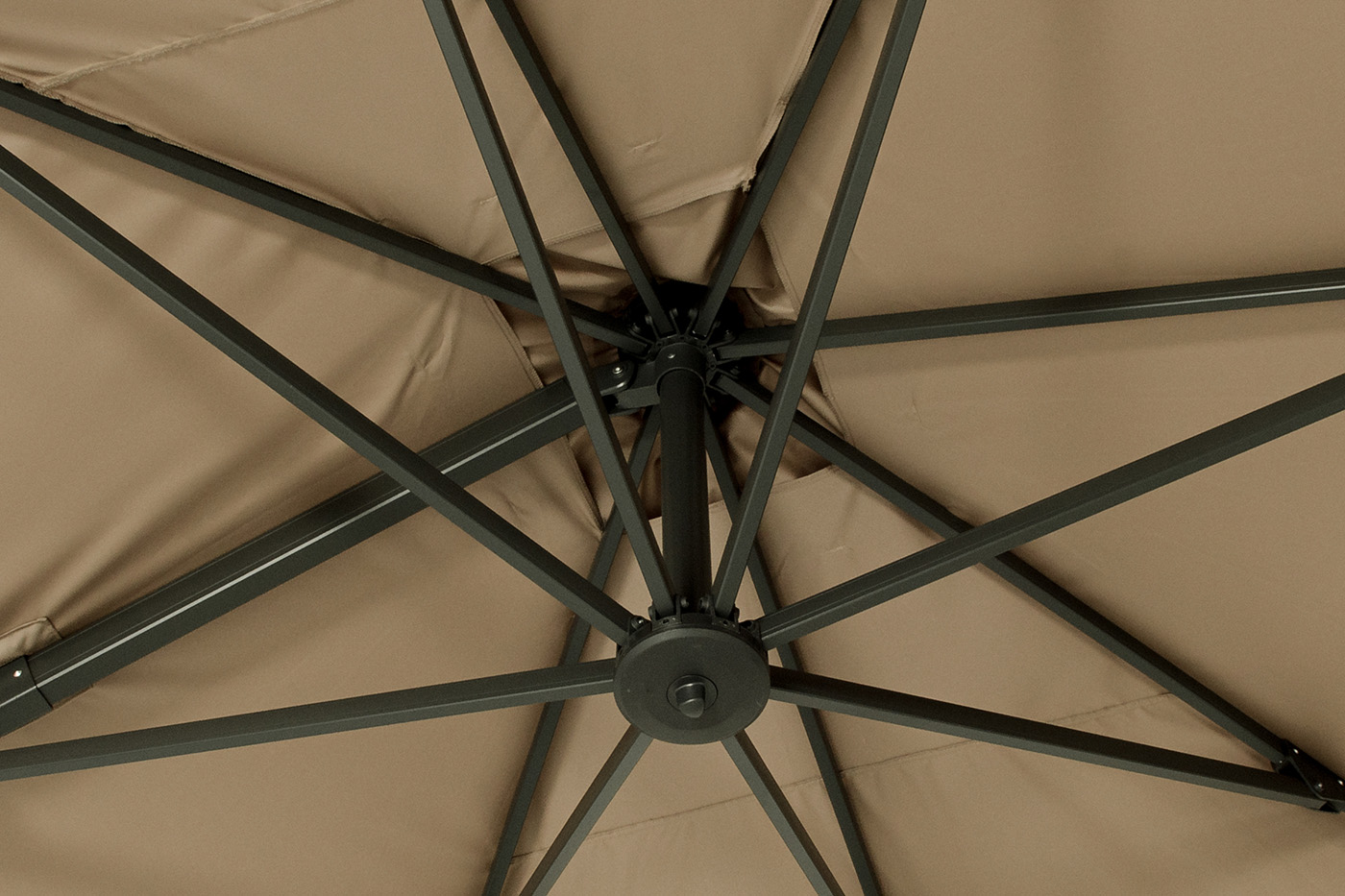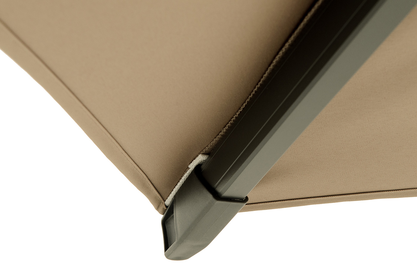 Тент уличного зонта изготовлен из прочного 100% полиэстера с водоотталкивающей пропиткой, что