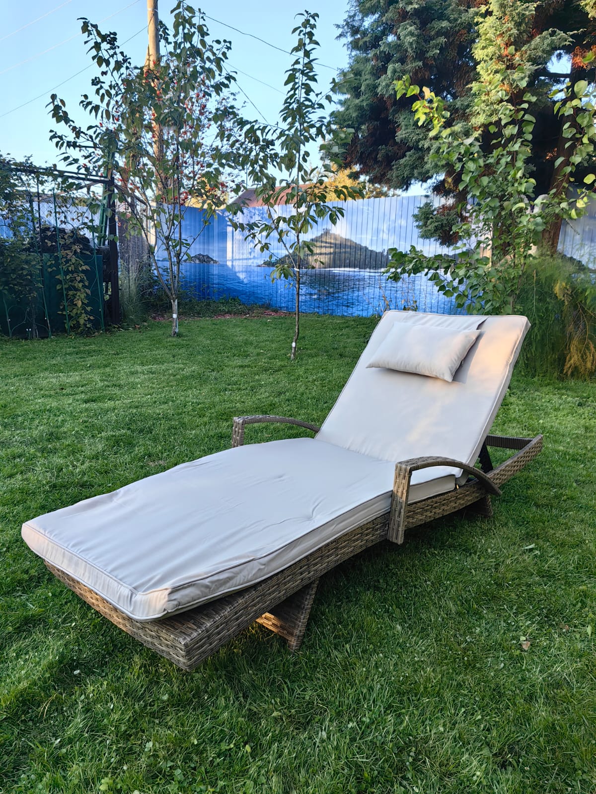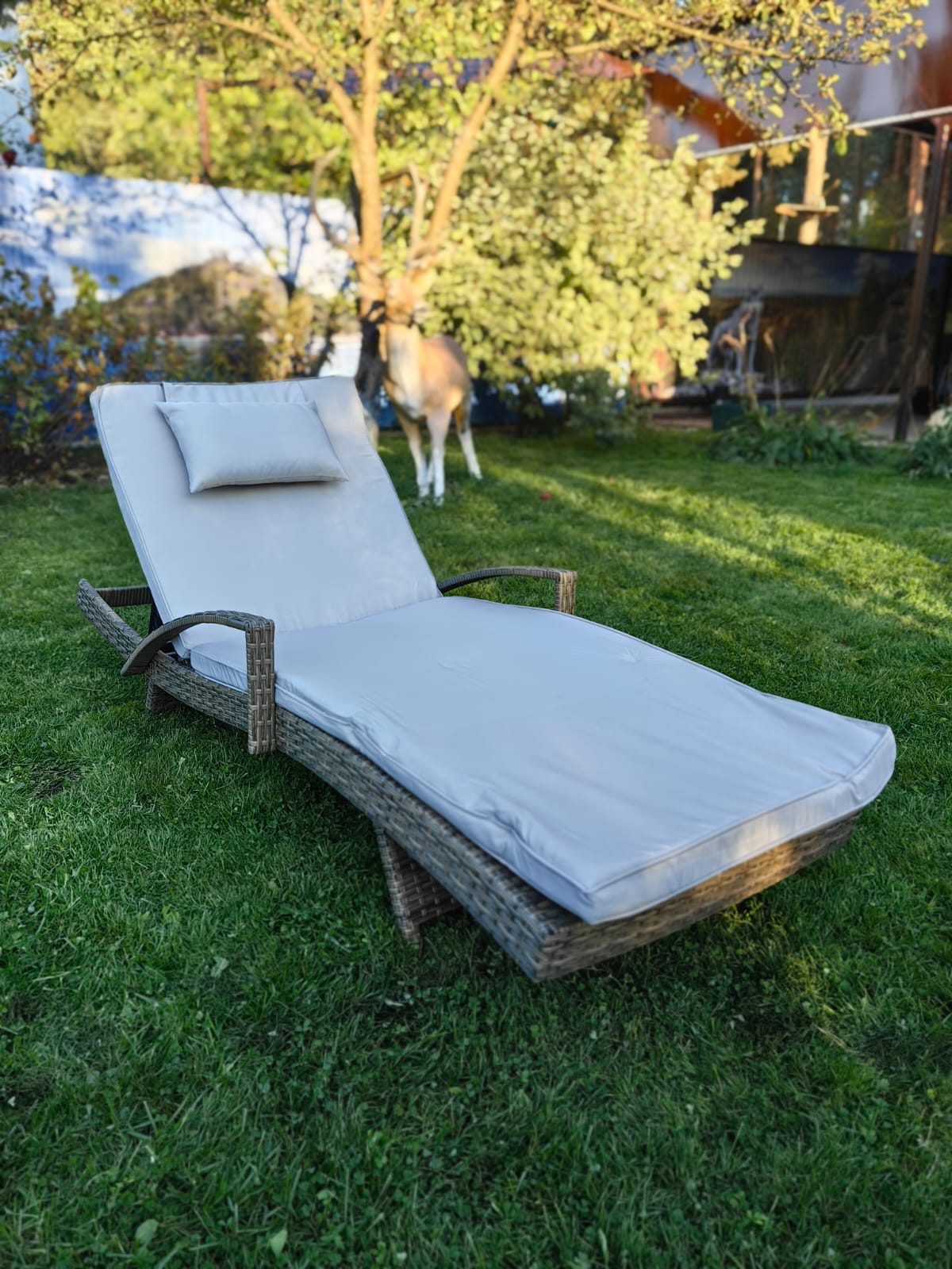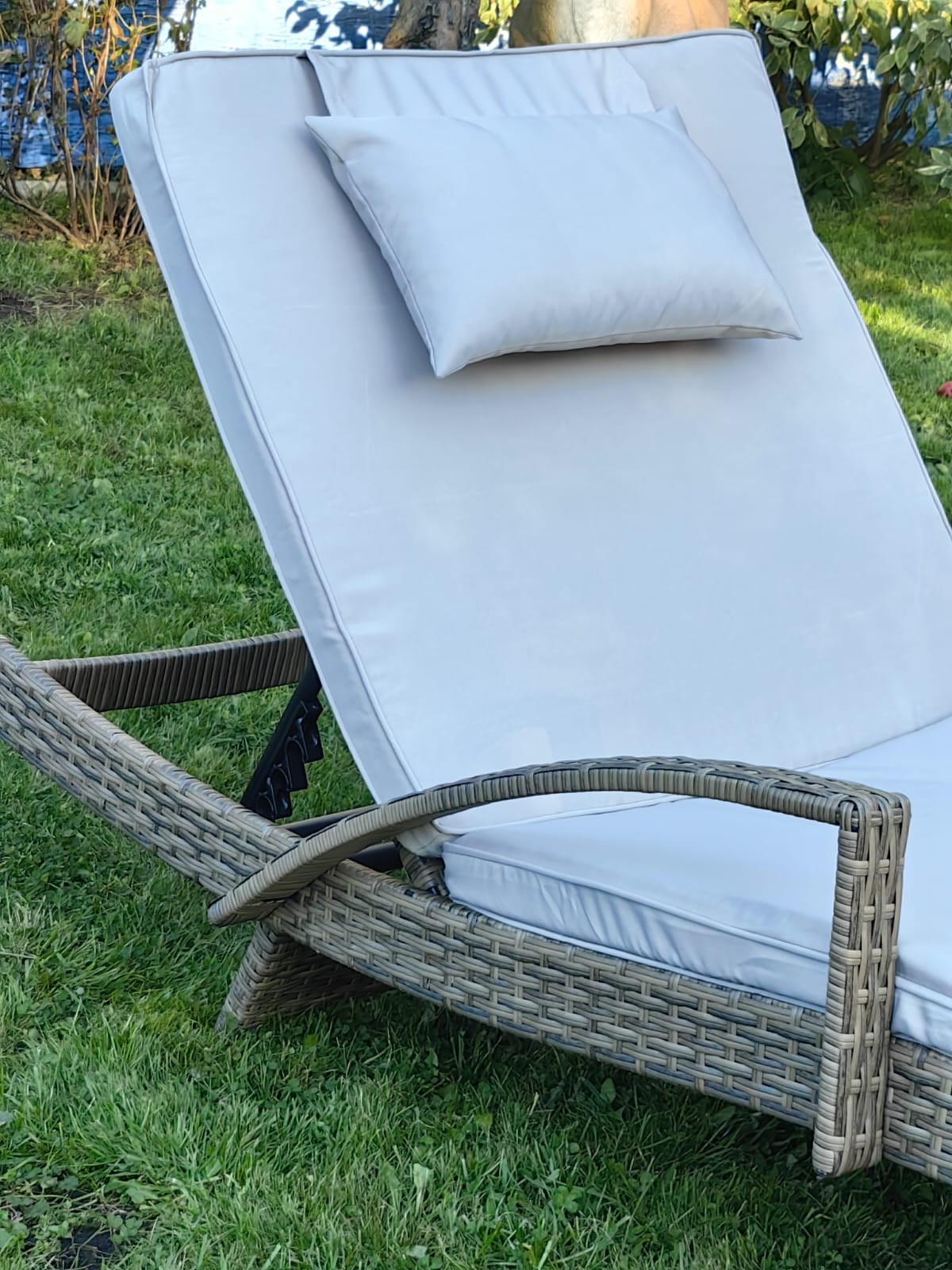 Плетеный шезлонг МАРА «MARA» с матрасом — Greige , изготовленный из стального каркаса с порошковым покрытием и ручным плетением из искусственного ротанга имеет 4-е положения регулировки подголовника.
