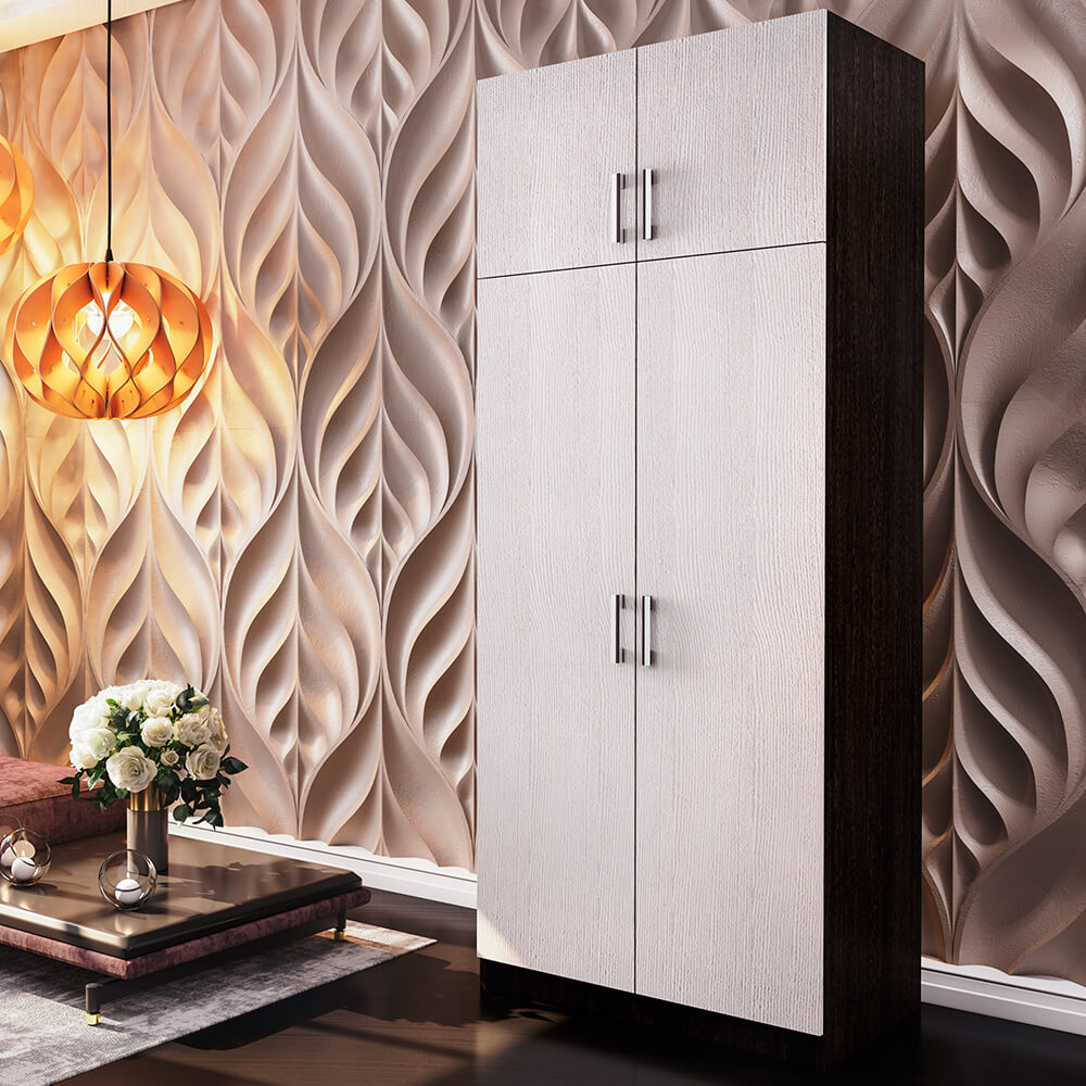 Шкаф имеет две створки, разделённые перегородкой, которая позволяет удобно организовать внутреннее пространство. Внутри вы найдёте просторное отделение для одежды на вешалках, несколько полок и выдвижных ящиков для хранения белья и аксессуаров.