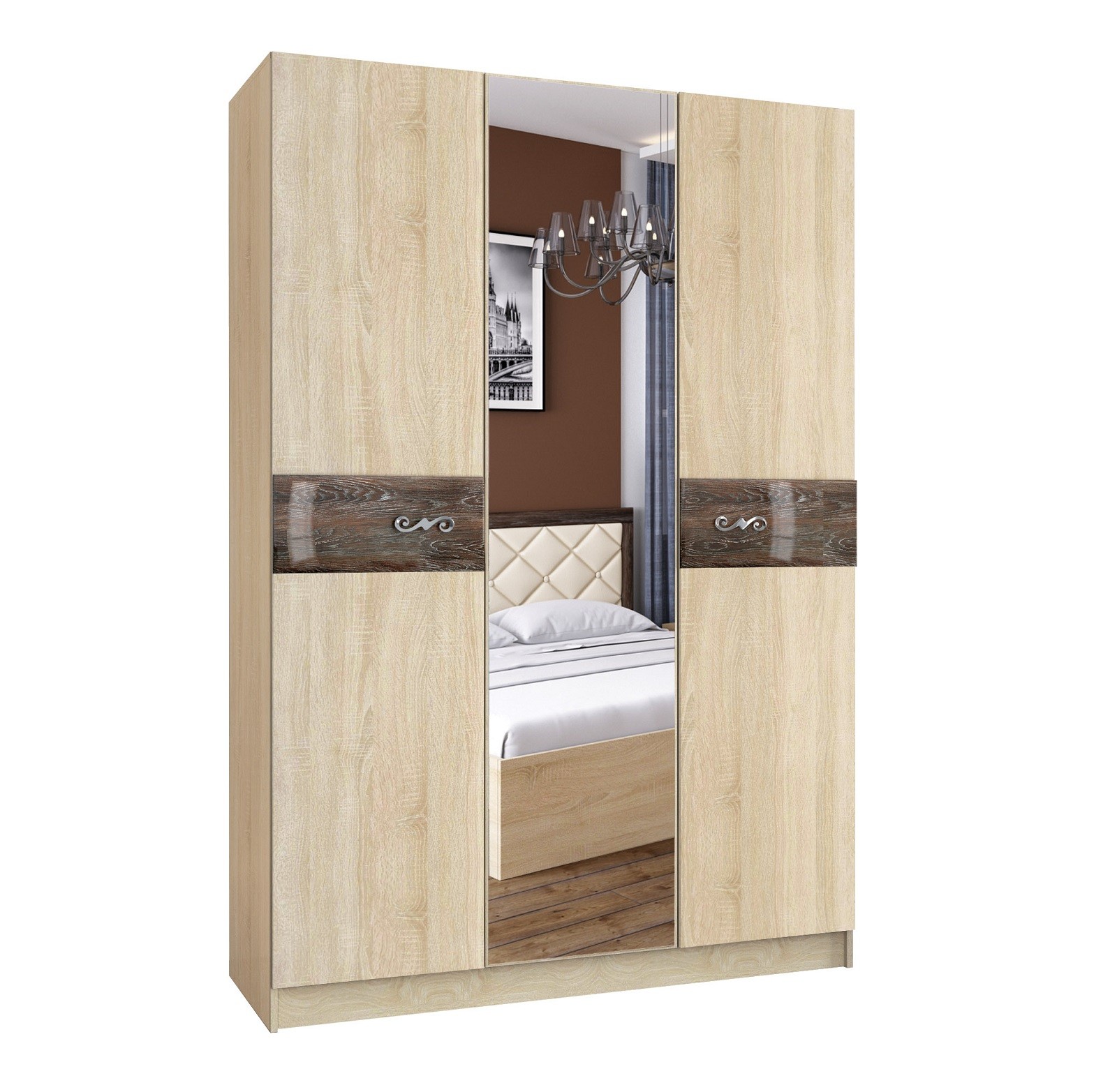 В поисках вместительного шкафа для спальни обратите внимание на трехстворчатый шкаф Мадлен. Наполнение шкафа - длинная продольная штанга и комплект полок. Всего одного такого шкафа будет достаточно, чтобы с комфортом разместить одежду на плечиках и вещи в сложенном виде. Изюминкой шкафа выступает комбинированный фасад с зеркалом, который визуально расширит Вашу комнату и позволит держать внешний вид под контролем.