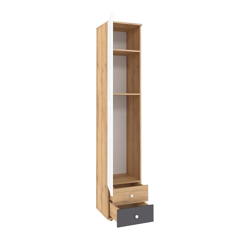 Шкаф-пенал для белья имеет ширину всего 400 мм, благодаря чему Вы сможете расположить его даже в небольшой по площади комнате. В комплекте три регулируемые по высоте полки и два выдвижных ящика на шариковых направляющих полного выдвижения. Каждый ящик выдерживает нагрузку до 15 кг, следовательно, все Ваши вещи будут убраны по местам. Данный шкаф представлен также и с белым фасадом.