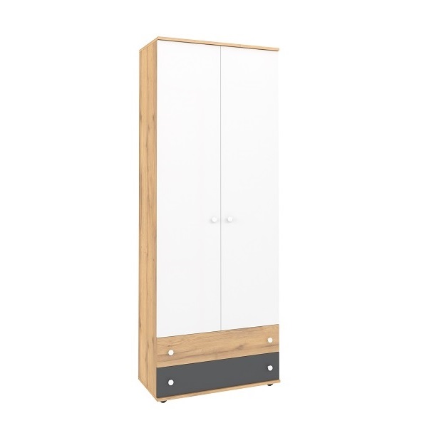 Шкаф из коллекции Лойс - практичное и функциональное решение для организации хранения в детской. Наполнение шкафа продумано для мелочей. Выдвижная штанга подойдет для размещения одежды на плечиках, комплект полок - для одежды в сложенном виде. В ящиках хватит места для гранения белья и других личных вещей ребенка. Кроме того, Вы имеете возможность выбрать цвет фасада шкафа: две белые дверцы, две в цвете "графит" или их комбинацию.