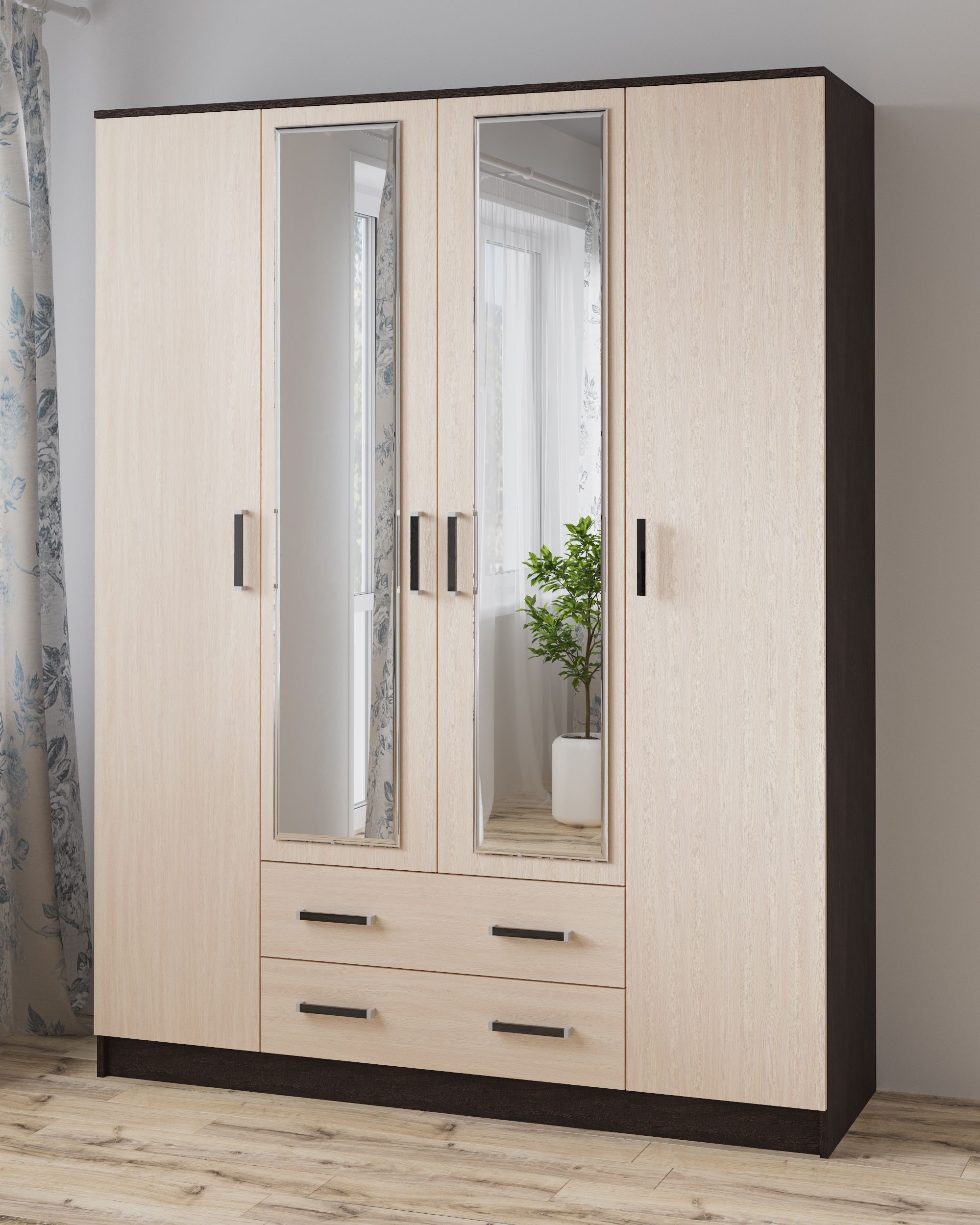 Шкаф комбинированный Лагуна шириной 160 см оснащен двумя зеркалами, полками, платяным отделом и выдвижными ящиками. Организуйте место хранения одежды, белья, аксессуаров в одном месте. Благодаря гармоничным пропорциям и универсальному дизайну шкаф будет гармонично смотреться с современной обстановке.