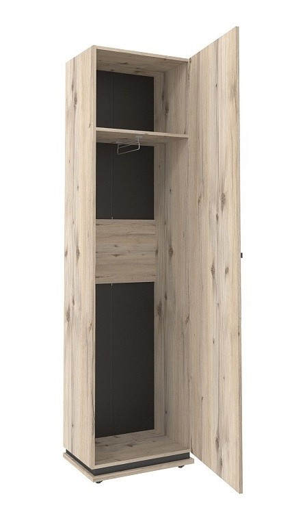 Распашной шкаф для одежды и белья комплектуется выдвижной штангой для одежды. При желании можно докупить и установить модуль NATURE 19 Полки (в комплекте 3 полки) тем самым изменив функционал шкафа. Фасад шкафа перенавешивается на правую и на левую сторону.