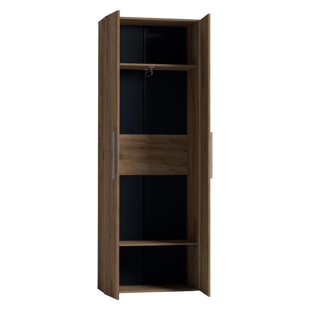 Распашной шкаф с глухими фасадами в декоре Дуб Табачный комплектуется выдвижной штангой для одежды. Глухие фасады с серой ручкой из массива. Регулируемые опоры шкафа помогут компенсировать неровности пола.