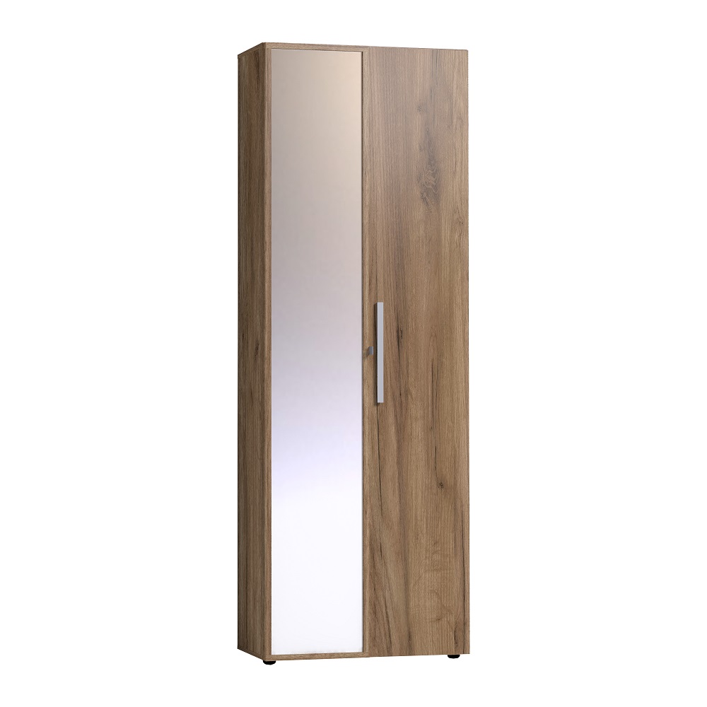 Двухдверный распашной шкаф легко открывается за ручку-петлю из микрофибры, которая устанавливается на одном зеркальном фасаде, другой - открывается за рамку. Шкаф комплектуется выдвижной штангой и двумя нишами сверху и снизу. Корпус шкафа выполнен в декоре Дуб Табачный. Регулируемые опоры компенсируют неровности пола.