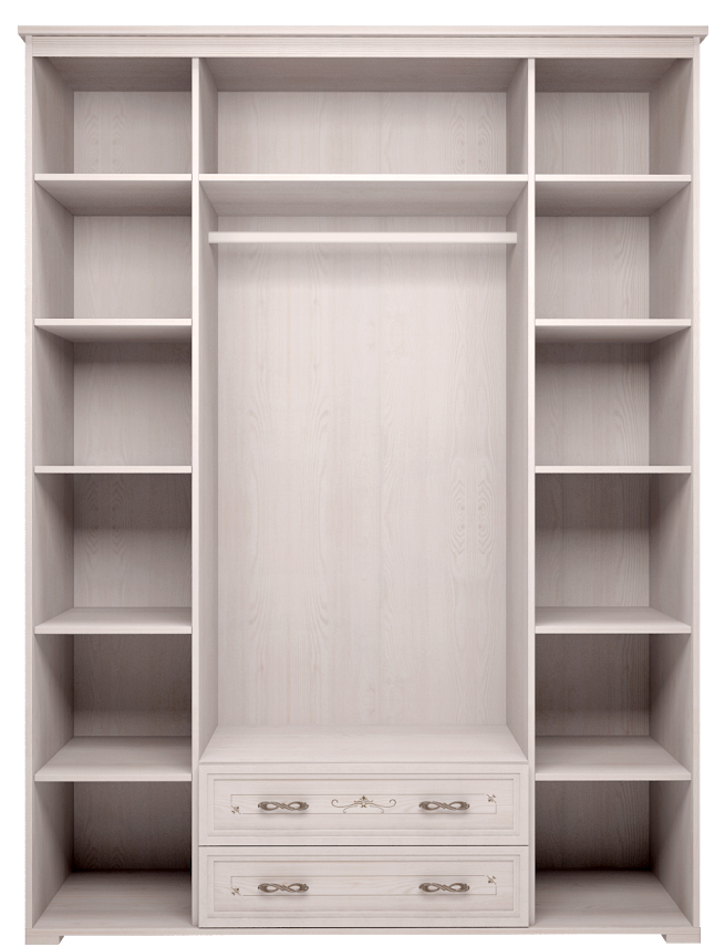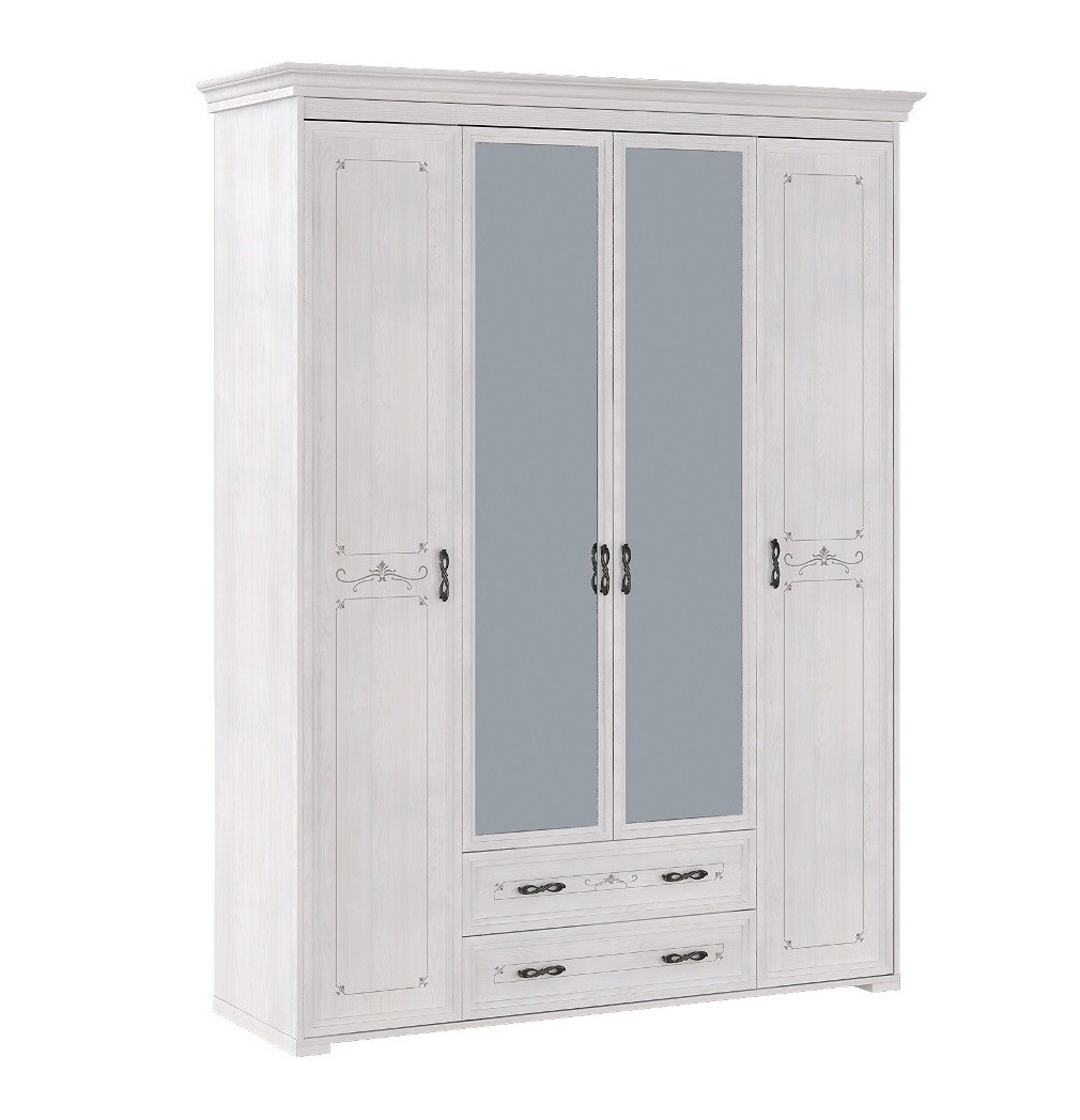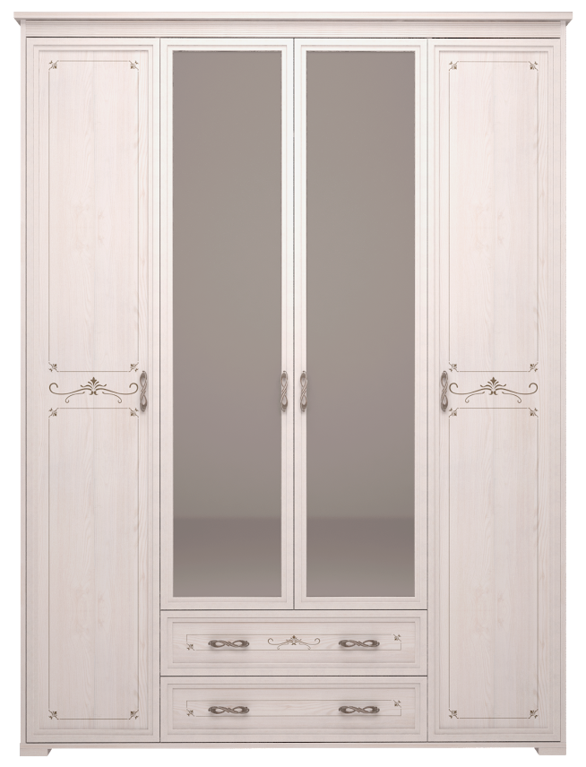Вместительный 4-х дверный шкаф из коллекции Афродита позволит разместить весь гардероб. Благодаря продуманному и функциональному наполнению шкафа Вы сможете грамотно организовать хранение в спальной комнате. Основная секция имеет длинную металлическую штангу для платьев, рубашек и другой одежды на плечиках. Две боковые секции имеют в общей сложности 12 глубоких полок для хранения и позволяют разместить не только оставшуюся одежду, а также постельное белье и другие спальные принадлежности. В нижней секции находятся два выдвижных ящика, которые послужат дополнительным местом для хранения Ваших вещей. Полезным дополнением являются зеркала на центральных дверцах — они визуально расширят пространство комнаты.