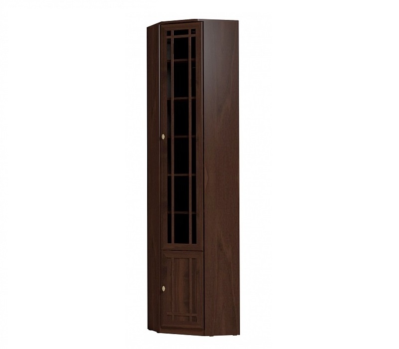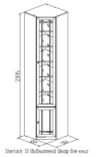 Угловой книжный шкаф - практичное решение для малогабаритных гостиных, библиотек или рабочих кабинетов, где каждый свободный сантиметр важно использовать рационально. Конструкция и габариты шкафа позволят Вам организовать полноценную зону для бережного хранения литературы и сопутствующих вещей. Модуль возможно установить в комнате, высота полотка которой не менее 240 см. Наполнение - комплект регулируемых по высоте полок. Фасад шкафа декорирован тонированным стеклом, свойства которого защитят Ваши книги от вредного воздействия лучей света и загрязнений. Шкаф для книг Sherlock 33 обязательнокрепится к стене за подвесы и межсекционной стяжкой с другими шкафами в комплекте.