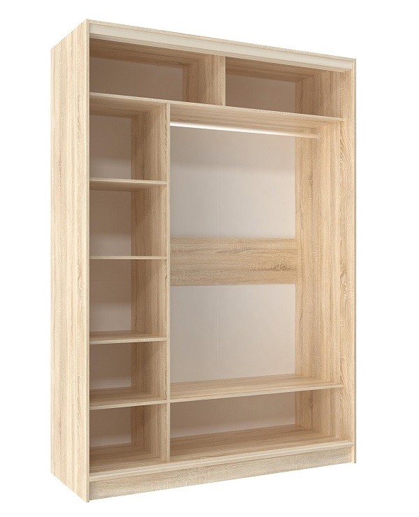 Вшкафу-купешириной 160 смнайдется место для гардероба всей семьи. Разместите в нем бельё, верхнюю одежду и аксессуары. Продуманное внутреннее наполнение шкафа состоит из стеллажа для белья, четырех больших ниш внизу и вверху, а также стационарной штанги длиной больше метра. Две двери на стальном профиле "Найди" в цвет основного декора шкафа плавно перемещаются. Зеркальная дверца с обратной стороны проклеена специальной защитной пленкой, которая предотвратит от падения осколков, если она разобьется.