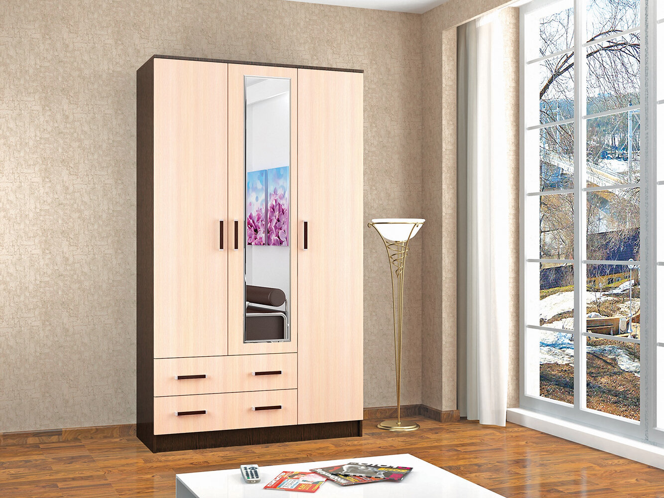 Компактный, но вместительный шкаф комбинированный Лагуна с зеркалом позволит разместить белье, одежду и аксессуары. Оригинальный дизайн и лаконичные формы дополнят интерьер спальни, гостиной или прихожей.