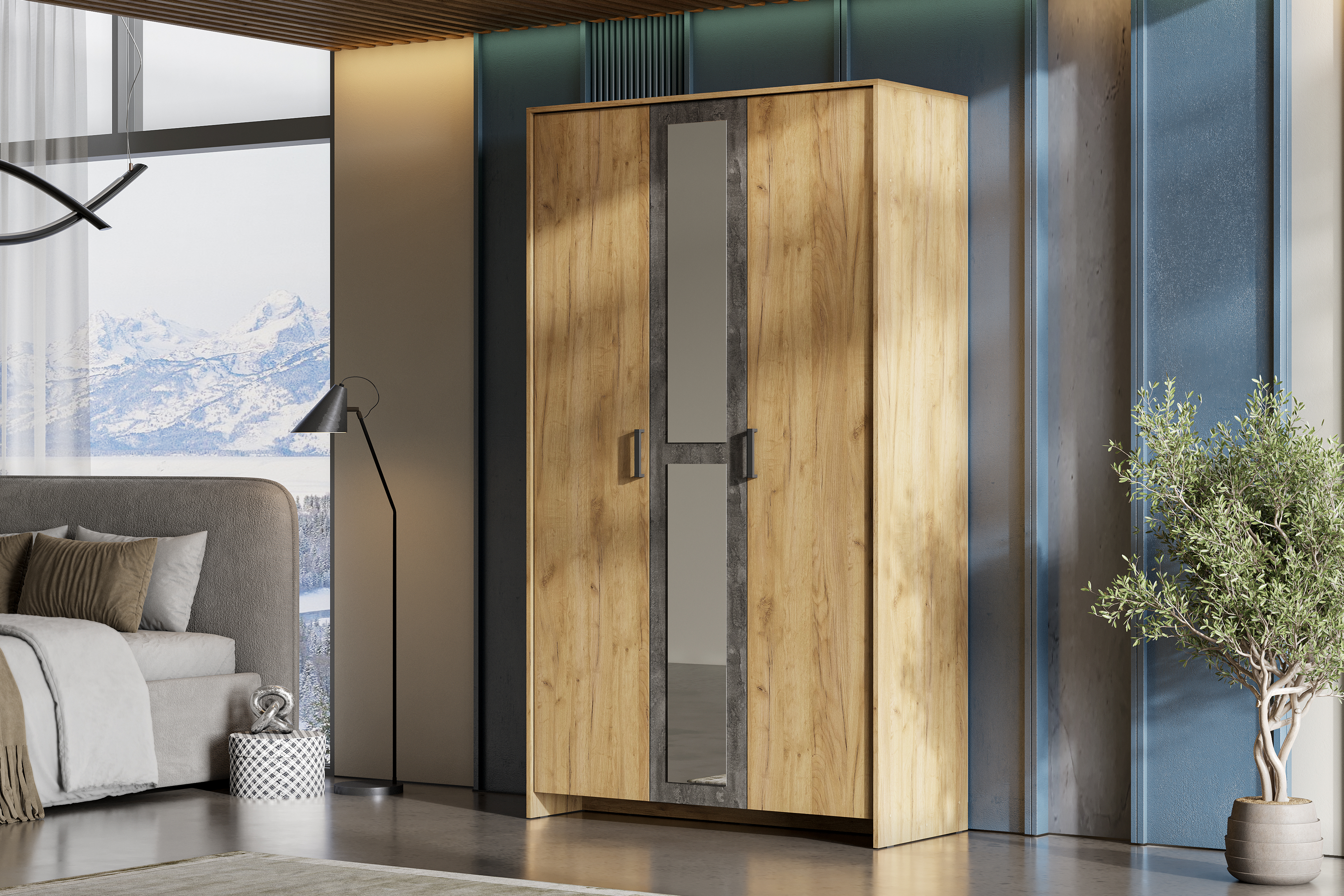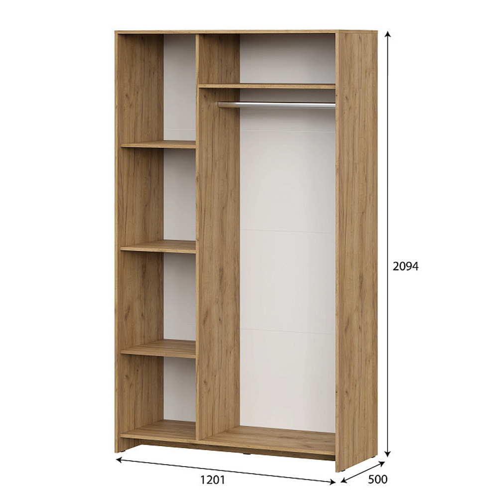 Грамотно разместить все вещи в спальне, не загромождая пространство, поможет шкаф из коллекции Лофт. Модель комплектуется створками разной ширины: по краям створки шириной 413 мм, средняя створка — 328 мм. Шкаф разделен вертикальной перегородкой на две секции: бельевую и платяную. В левой бельевой секции располагаются 2 съемных и 1 стационарная полки. В правой платяной секции - стационарная полка вверху и металлическая штанга. В комплектацию шкафа входят два зеркала 200х901 мм, которые по Вашему желанию приклеиваются на центральную створку при сборке.