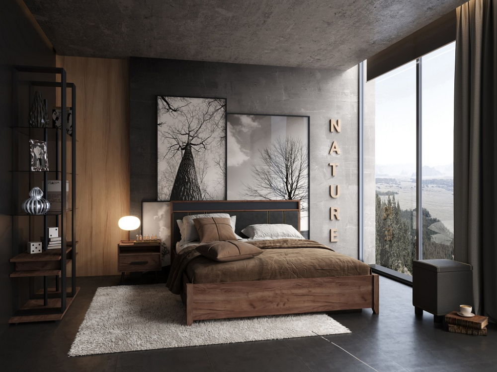 Простые прямые линии, отсутствие сглаженных углов и лишних изгибов придают спальне NATURE особую атмосферу стиля лофт.Изголовье в древесной раме, декоративная строчка золотой нитью на мягких подушечках кровати из черной экокожи – изюминка спальни NATURE. Максимально рационально использовать квадратные метры спальнипозволит подъемное основание, которое идет в комплекте с кроватью. Благодаря газлифтам, основание поднимается без усилий и обеспечивает доступ к вместительному внутреннему коробу, изолированному от пыли.