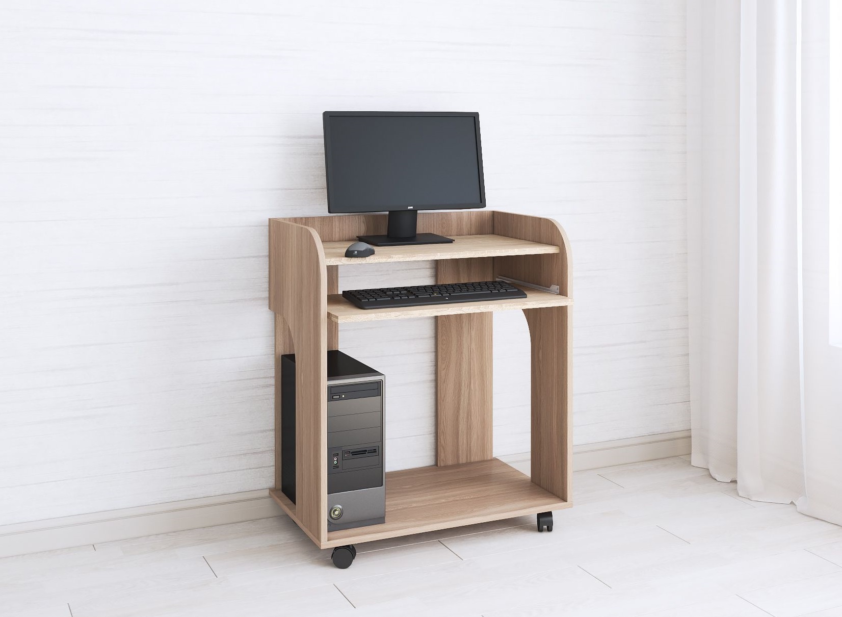 Грета-10 - модель компьютерного стола для любителей минимализма и порядка. Оснащен всем самым необходимым: компактной столешницей, на которой поместится моноблок или ноутбук, нижней полкой для процессора и выезжающей открытой полкой на роликовых направляющих для клавиатуры. Размер стола позволит разместить его даже в небольшом помещении, не загромождая пространство. А колесные опоры - свободно передвигать стол по комнате.