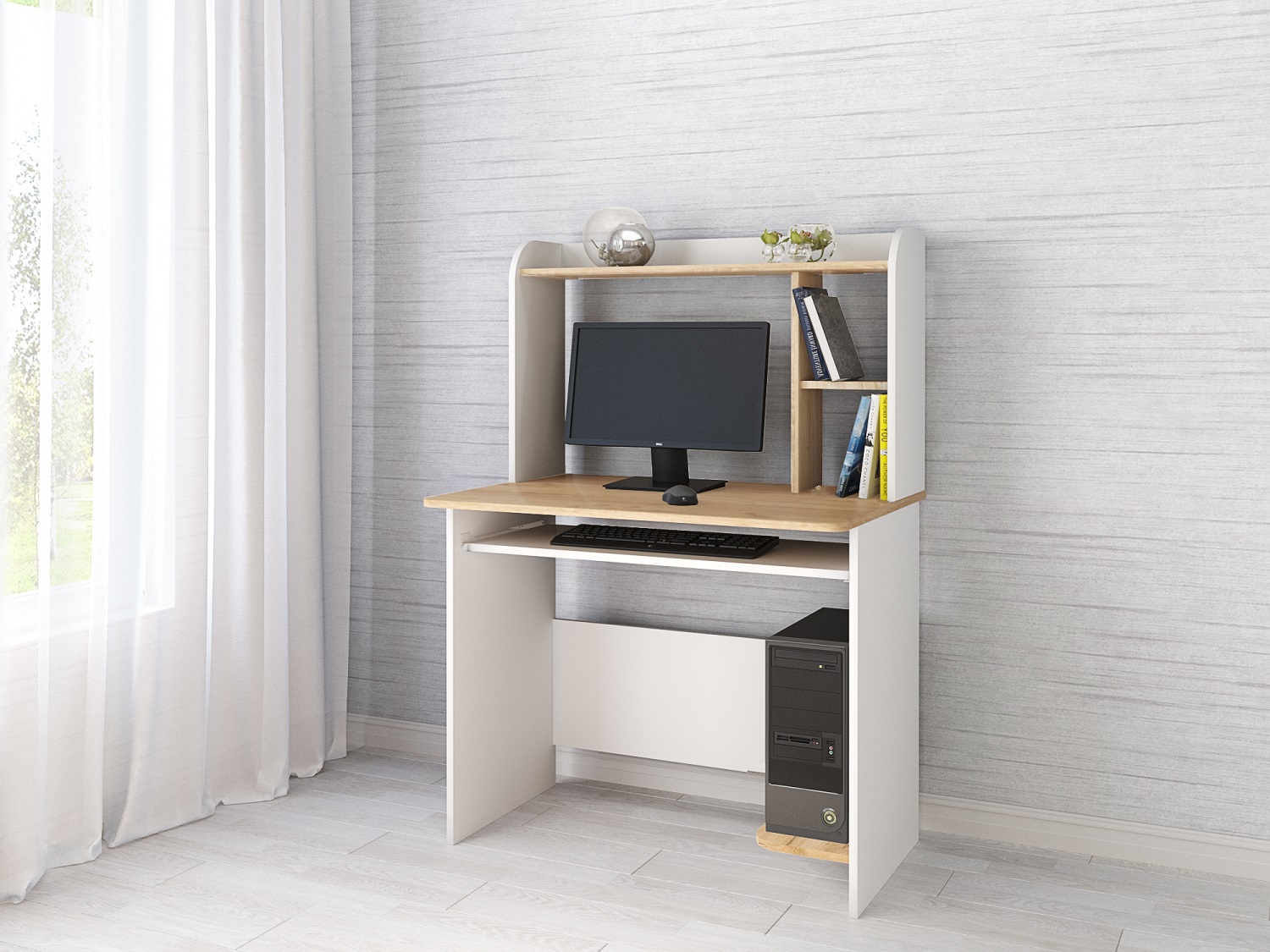 Модель компьютерного стола Грета-2 подойдет всем, кому для работы необходим не только компьютер, но и просторная столешница. Ее ширина в 90 см позволит Вам комфортно располагаться за столом, не стесняя движений, а скругленные углы обеспечат безопасность. Выдвижная панель для клавиатуры установлена на роликовые направляющие. Опоры стола имеют пластиковые подпятники, предохраняющие напольное покрытие от повреждения. Функциональная надстройка пригодится для хранения органайзера, документов и книг.