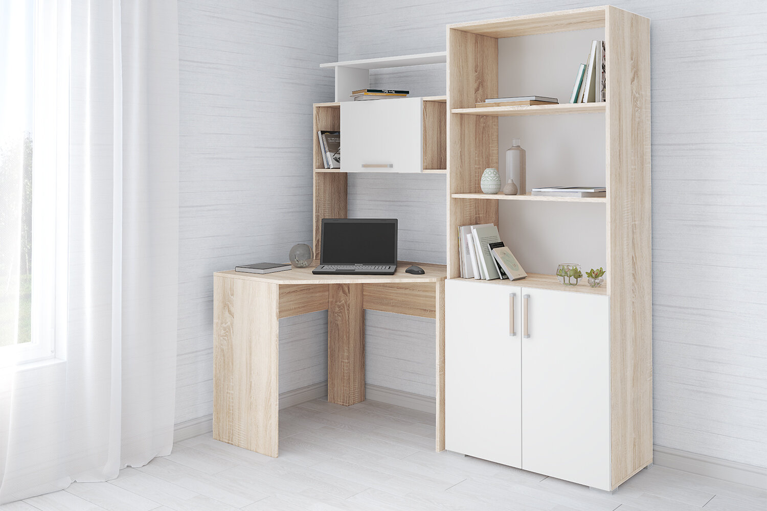 Угловой компьютерный стол Квартет-12 состоит из просторной столешницы и надстройки с отрытыми и закрытыми нишами. За таким столом будет приятно и комфортно работать, учиться или заниматься хобби. Угловая конфигурация стола позволит сэкономить пространство в комнате, поэтому Вы сможете обустроить рабочую зону даже в малогабаритном помещении. Комбинированный стеллаж вместит в себя книги, канцелярию, Ваши личные вещи и предметы декора.